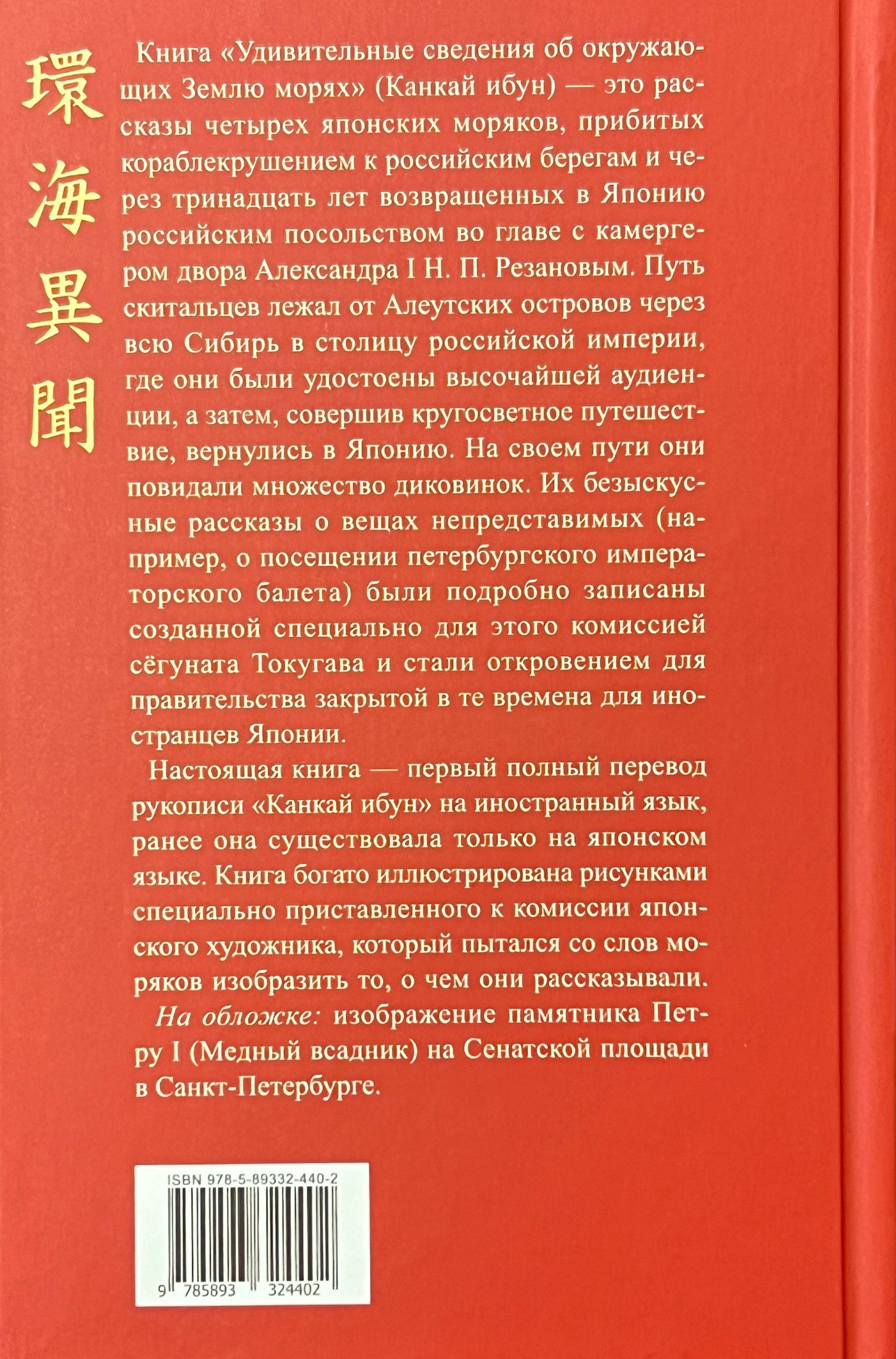 Книга «Удивительные сведения об окружающих Землю морях» — это рассказы четырех японских моряков, прибитых кораблекрушением к российским берегам и возвращенных в Японию российским посольством во главе с камергером двора Александра I Н. П. Резановым. Путь скитальцев лежал от Алеутских островов через всю Сибирь в столицу российской империи, где они были удостоены высочайшей аудиенции. Через тринадцать лет, совершив кругосветное путешествие, моряки вернулись в Японию. На своем пути они повидали множество диковинок. Их безыскусные, часто уморительно смешные рассказы (например, о посещении петербургского балета) были подробно записаны созданной специально для этого комиссией сёгуната Токугава и стали откровением для правительства закрытой для иностранцев Японии. Текст снабжен множеством цветных иллюстраций, выполненных японским художником, включенным в состав сёгунской комиссии, который со слов моряков пытался изобразить все то невероятное, что им довелось увидеть в дальних краях и о чем они пытались поведать изумленным чиновникам.