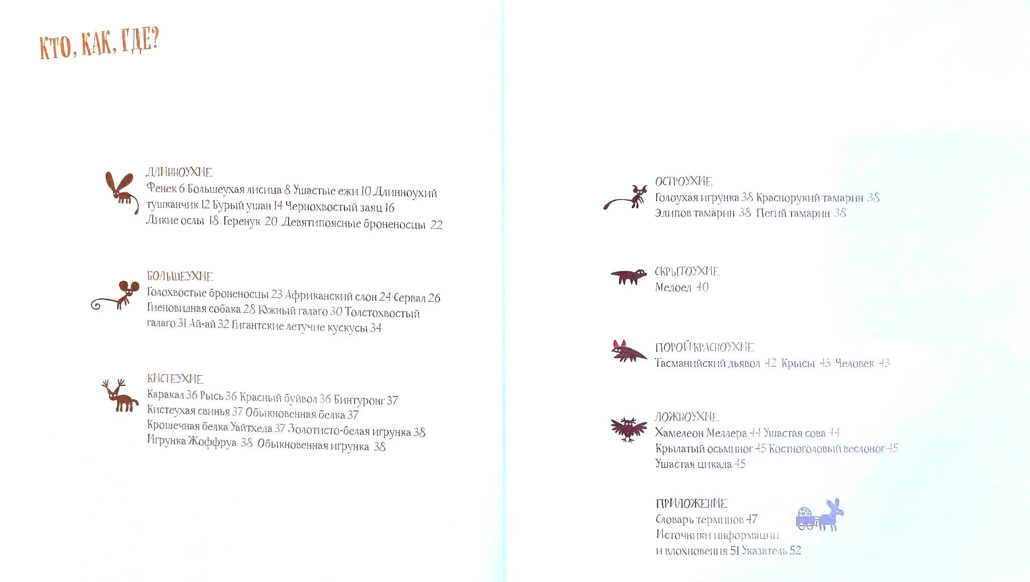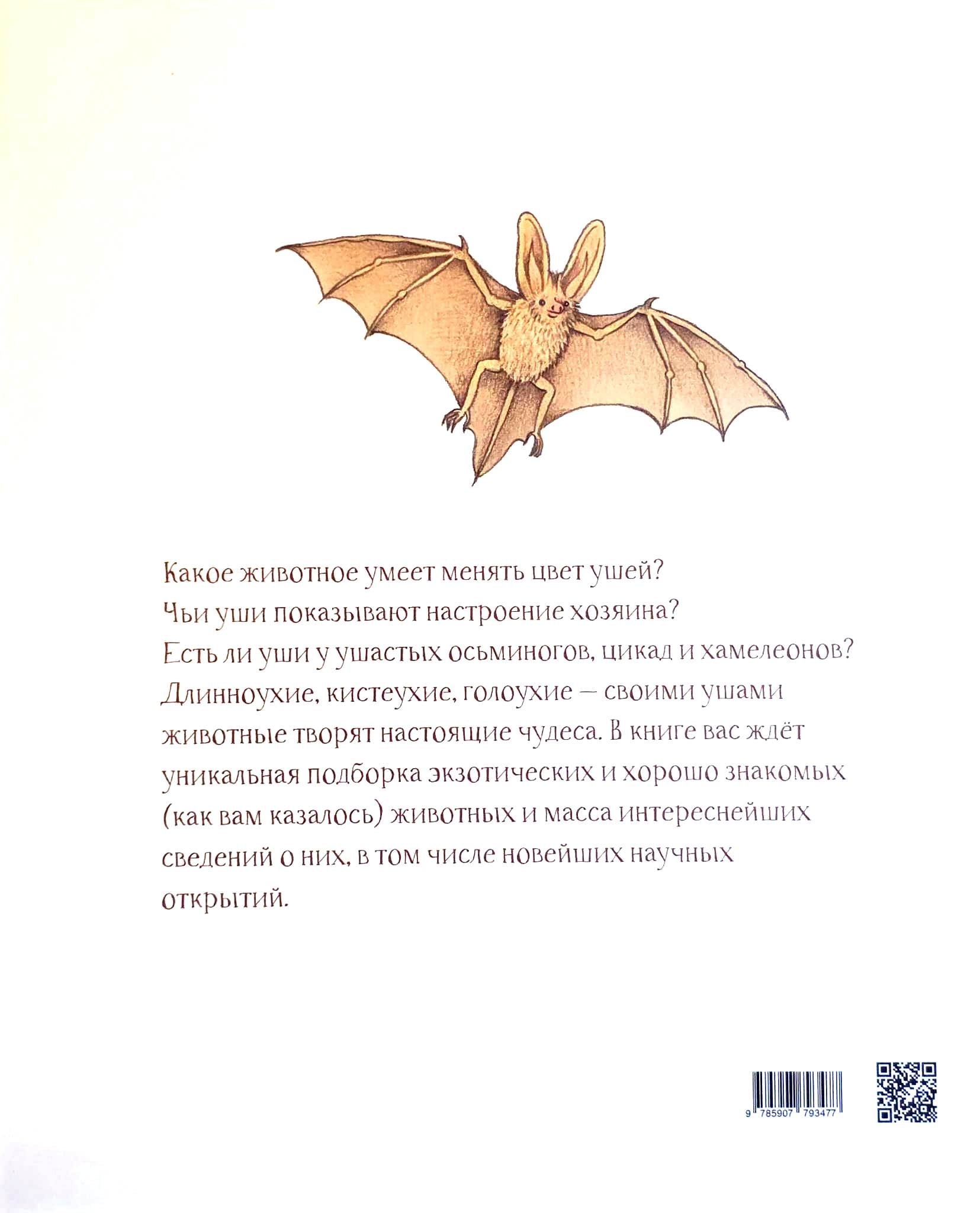 Из новой книги Лены Анлауф с рисунками Виталия Константинова вы узнаете, как много у ушей разных «профессий». Ушные раковины не только усиливают звук, но и регулируют температуру тела, спасают от хищников (причём разными способами!), помогают животным разговаривать друг с другом да ещё и «улыбаться». А бывает, что они мешают своим обладателям — и как же звери справляются? Уши-мухобойки, уши-ветроуказатели, маскировочные уши, бойцовские уши, ложные уши — добро пожаловать в богатый и разнообразный ушной мир!