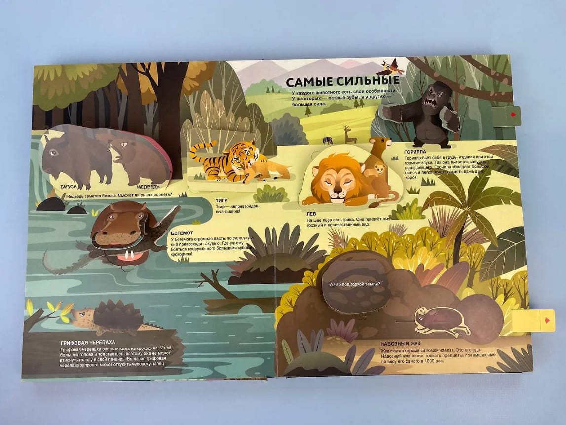 Ответить на все вопросы тебе помогут познавательные окошки, подвижные элементы у разнообразных животных, а также великолепная панорама джунглей! Скорее открывай все окошки — будет интересно!