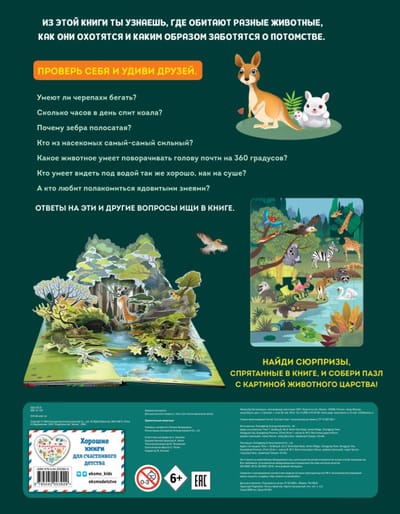 1. Каждый разворот книги — словно отдельный уголок загадочного животного царства. Узнайте из книги: умеют ли черепахи бегать? А сколько часов в день спит коала? Почему зебра полосатая? Кто из насекомых самый сильный?
