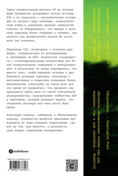 »Уфологи в штатском» — это включенное исследование уфомании, охватившей планету в середине прошлого века и не утихающей до сих пор. На съезде уфологов и на американской военной базе, в пустынях Невады и трущобах Детройта Пилкингтон беседует с самыми разными людьми, от энтузиастов, уверенных в существовании пришельцев, до уклончивых спецагентов, глубоко погружается в историю предполагаемых контактов с внеземной жизнью и приходит к парадоксальным выводам, которые перевернут ваше представление не только об инопланетянах, но и о людях.