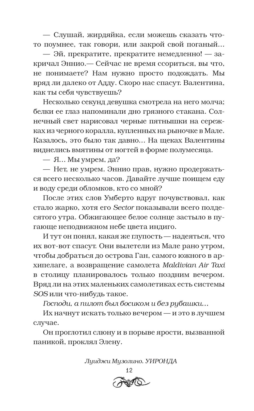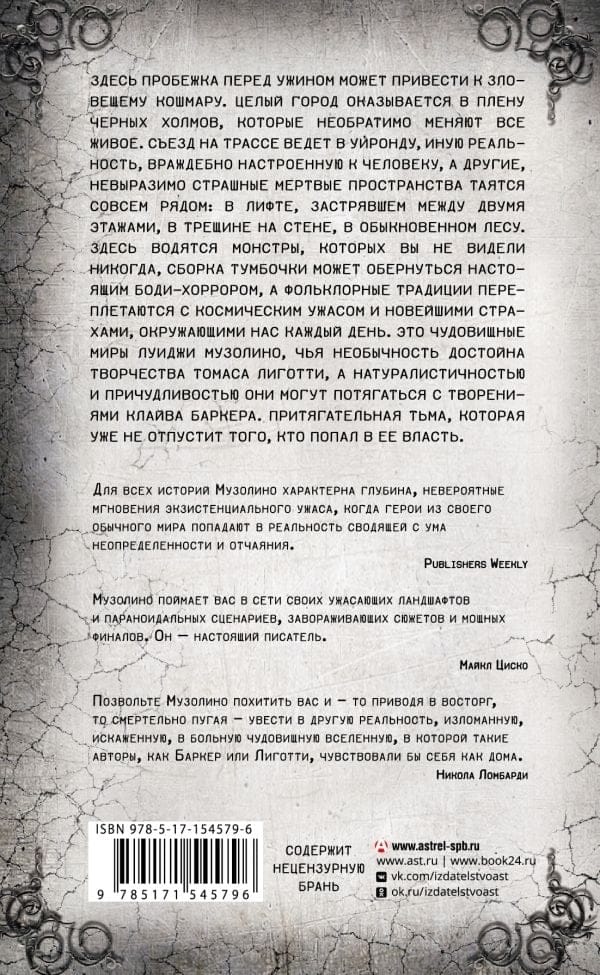 Здесь пробежка перед ужином может привести к зловещему кошмару. Целый город оказывается в плену черных холмов, которые необратимо меняют все живое. Съезд на трассе ведет в Уиронду, иную реальность, враждебно настроенную к человеку, а другие, невыразимо страшные мертвые пространства таятся совсем рядом: в лифте, застрявшем между двумя этажами, в трещине на стене, в обыкновенном лесу. Здесь водятся монстры, которых вы не видели никогда, сборка тумбочки может обернуться настоящим боди-хоррором, а фольклорные традиции переплетаются с космическим ужасом и новейшими страхами, окружающими нас каждый день. Это чудовищные миры Луиджи Музолино, чья необычность достойна творчества Томаса Лиготти, а натуралистичностью и причудливостью они могут потягаться с творениями Клайва Баркера. Притягательная тьма, которая уже не отпустит того, кто попал в ее власть.