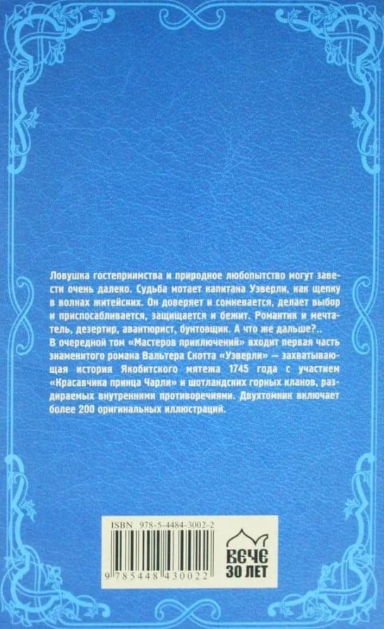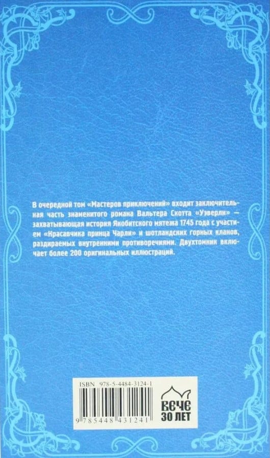 Ловушка гостеприимства и природное любопытство могут завести очень далеко. Судьба мотает капитана Уэверли, как щепку в волнах житейских. Он доверяет и сомневается, делает выбор и приспосабливается, защищается и бежит. Романтик и мечтатель, дезертир, авантюрист, бунтовщик. А что же дальше?.. В первый том «Мастеров приключений» входит первая часть знаменитого романа Вальтера Скотта «Уэверли» - захватывающая история Якобитского мятежа 1745 года с участием «Красавчика принца Чарли» и шотландских горных кланов, раздираемых внутренними противоречиями. Во второй том «Мастеров приключений» входит заключительная часть знаменитого романа Вальтера Скотта «Уэверли». Двухтомник включает более 200 оригинальных иллюстраций.