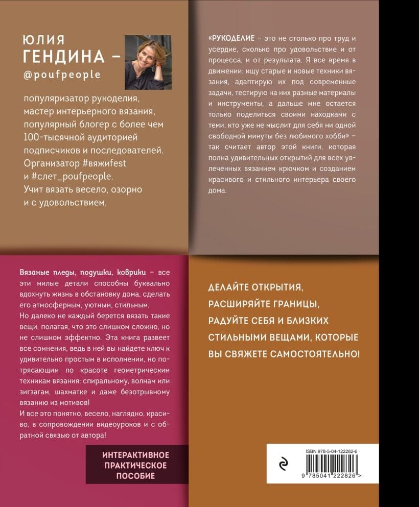 «Рукоделие — это не столько про труд и усердие, сколько про удовольствие и от процесса, и от результата» - так считает мастер интерьерного вязания, популярный блогер с более чем 100-тысячной аудиторией учеников и последователей, популяризатор ручного вязания Юлия Гендина. Это издание появилось на свет после оглушительного успеха первой книги автора «Самый нескучный плед», и, как и она, наполнено удивительными открытиями для всех увлеченных вязанием крючком и созданием красивого и стильного интереьера своего дома. Вязаные пледы, подушки, коврики - все эти милые детали способны буквально вдохнуть жизнь в обстановку дома, сделать его атмосферным, уютным, стильным. Но далеко не каждый берется вязать такие вещи, полагая, что это слишком сложно, но не слишком эффектно. Эта книга развеет все сомнения, ведь в ней вы найдете ключ к удивительно простым в исполнении, но потрясающим по красоте геометрическим техникам вязания: спиральному, волнам или зигзагам, шахматке, и даже безотрывному вязанию из мотивов! И все это понятно, весело, наглядно, красиво, в сопровождении видеоуроков и с обратной связью от автора! Делайте открытия, расширяйте границы, радуйте себя и близких стильными вещами, которые вы свяжете самостоятельно!