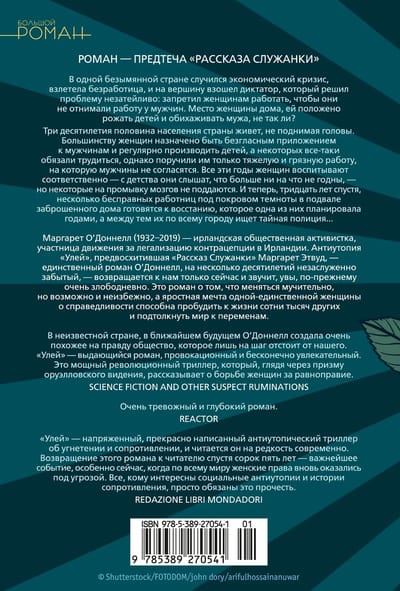 Маргарет О’Доннелл (1932–2019) — ирландская общественная активистка, боровшаяся за права женщин, деятельная участница движения за легализацию контрацепции в Ирландии. Антиутопия «Улей», на пять лет опередившая и предвосхитившая «Рассказ Служанки» Маргарет Этвуд, — единственный роман О’Доннелл, классика феминистской литературы, на несколько десятилетий незаслуженно забытый, — возвращается к нам только сейчас и звучит, увы, по-прежнему очень злободневно. Это роман о том, что меняться мучительно, но возможно и неизбежно, а яростная мечта одной-единственной женщины о справедливости способна пробудить к жизни сотни тысяч других и подтолкнуть мир к переменам.