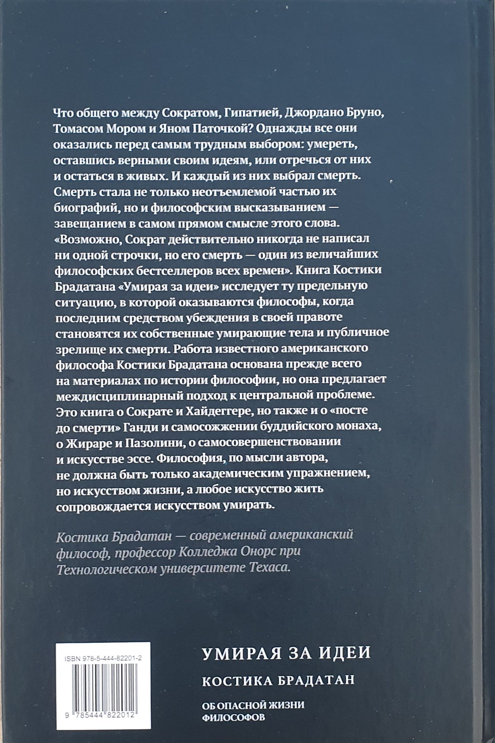 «Возможно, Сократ действительно никогда не написал ни одной строчки, но его смерть — один из величайших философских бестселлеров всех времен». Книга Костики Брадатана «Умирая за идеи» исследует ту предельную ситуацию, в которой оказываются философы, когда последним средством убеждения в своей правоте становятся их собственные умирающие тела и публичное зрелище их смерти.