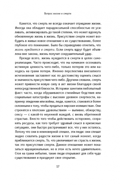 Работа основана прежде всего на материалах по истории философии, но она предлагает междисциплинарный подход к центральной проблеме. Это книга о Сократе и Хайдеггере, но также и о «посте до смерти» Ганди и самосожжении буддийского монаха, о Жираре и Пазолини, о самосовершенствовании и искусстве эссе. Философия, по мысли автора, не должна быть только академическим упражнением, но искусством жизни, а любое искусство жить сопровождается искусством умирать.