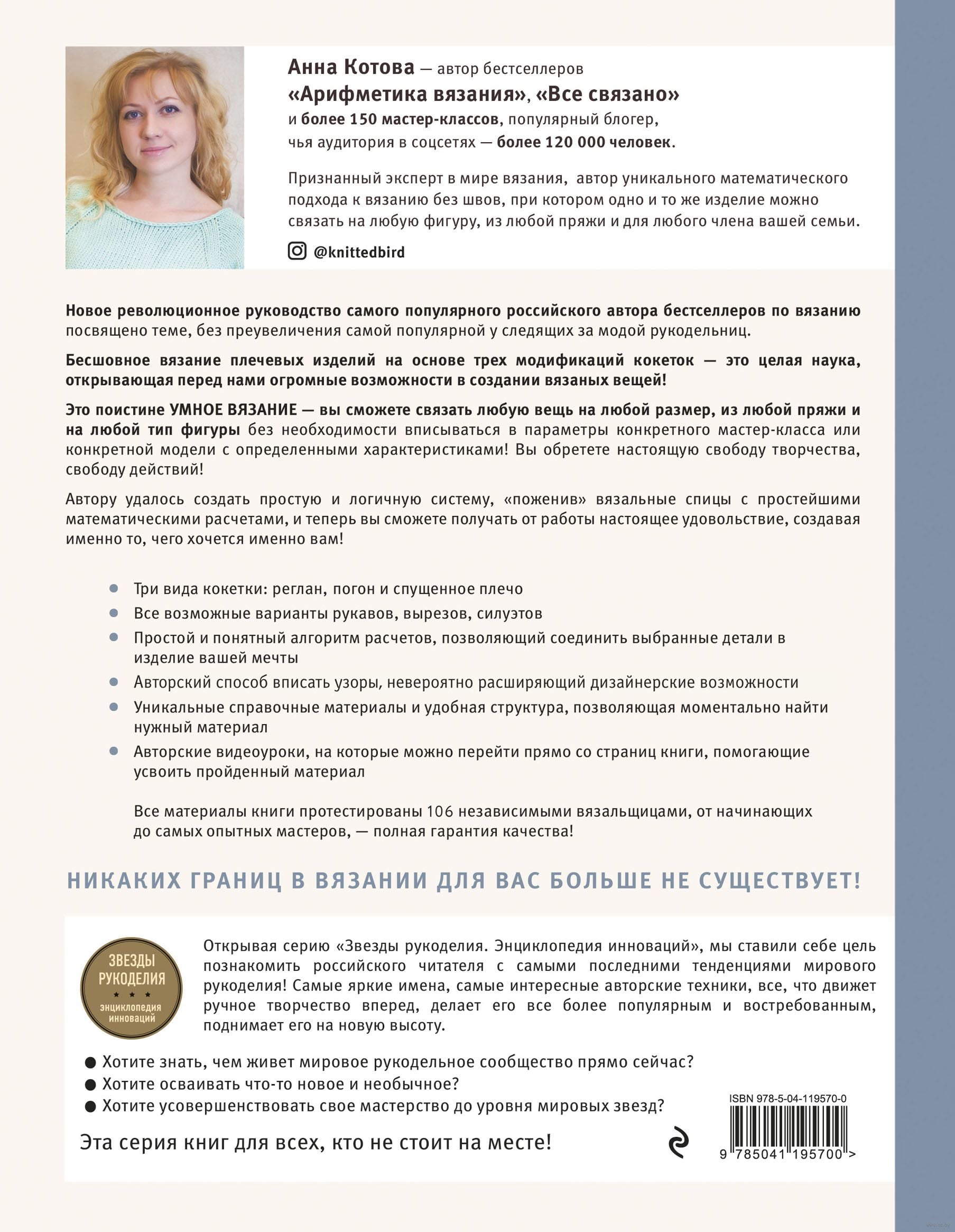 Более 9000 тысяч вариантов плечевых изделий на основе трех различных кокеток в одной книге! Кажется фантастикой. Но авторский метод расчетов популярнейшего блогера и великолепного мастера, автора двух бестселлерови популярного блогера с аудиторией более 120000 человек Анны Котовой превращает фантазию в реальность. Эта книга - настоящий конструктор, где из множества представленных моделей силуэтов, горловин, рукавов и на основе реглана, погона или спущенного плеча вы сами соберете нужный вам фасон того или иного изделия. Но и это еще не все! Вы свяжете вещь своей мечты именно на свой размер, из той пряжи, которую сами хотите использовать, и готовая вещь сядет на вас как влитая, даже если фигура далека от идеала. Вы легко оденете своих детей, мужа и даже друзей. И никаких нервов, никаких перевязов, никаких волнений, что что-то не получится. Как такое возможно? Все секреты авторского метода Анны раскроет эта книга, способная заменить целую вязальную библиотеку! «Около 5 лет я работала, писала мастер-классы по вязанию, оттачивала свои волшебные формулы, доводила до совершенства описание процессов. И, кажется, все это время я работала для того, чтобы сегодня, сейчас вы могли взять в руки эту книгу. Тысячи часов работы, сотни связанных изделий и сотни довольных вязальщиц, десятки тестирований, на которых мы разбирали каждую главу на отдельные формулы, числа, буквы и собирали снова — все это для того, чтобы вы могли связать свою мечту. Ведь мы вяжем не вещи, мы воплощаем свои желания, мечты.» Анна Котова