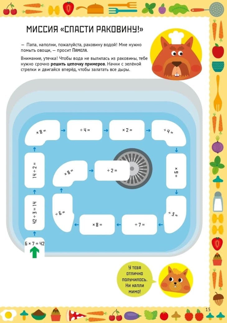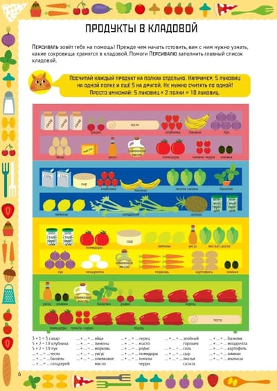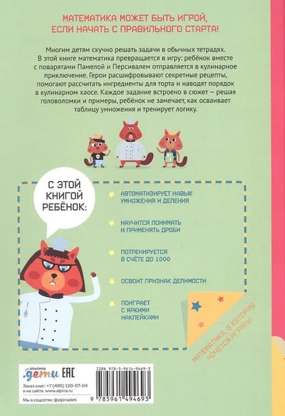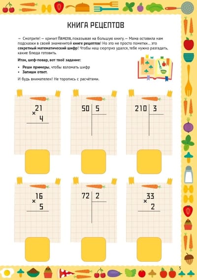 Математический старт. Умножение и деление — тетрадь, которая поможет ребёнку от 9 лет без страха и скуки автоматизировать навык умножения, деления и дробей, применяя их в реальной жизни. Вместе с шеф-поваром Поппи, мистером Пеппером и их детьми Памелой и Персивалем ребёнок отправится в кулинарное путешествие на настоящую ресторанную кухню, чтобы раскрыть секреты идеальных рецептов и разгадать главные математические тайны приготовления еды.