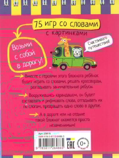 Умный блокнот «75 игр со словами» развивает творческие речевые способности ребёнка, его слуховое восприятие, внимание, воображение. В пособии представлены игры со словами, иллюстрированные кроссворды, занимательные ребусы. Ответы на задания даны на пяти последних страницах блокнота. Пособие предназначено для детей от 5 лет.