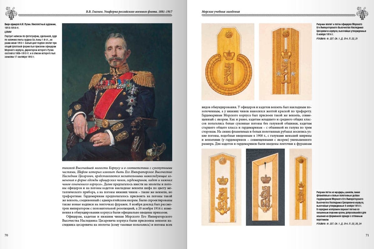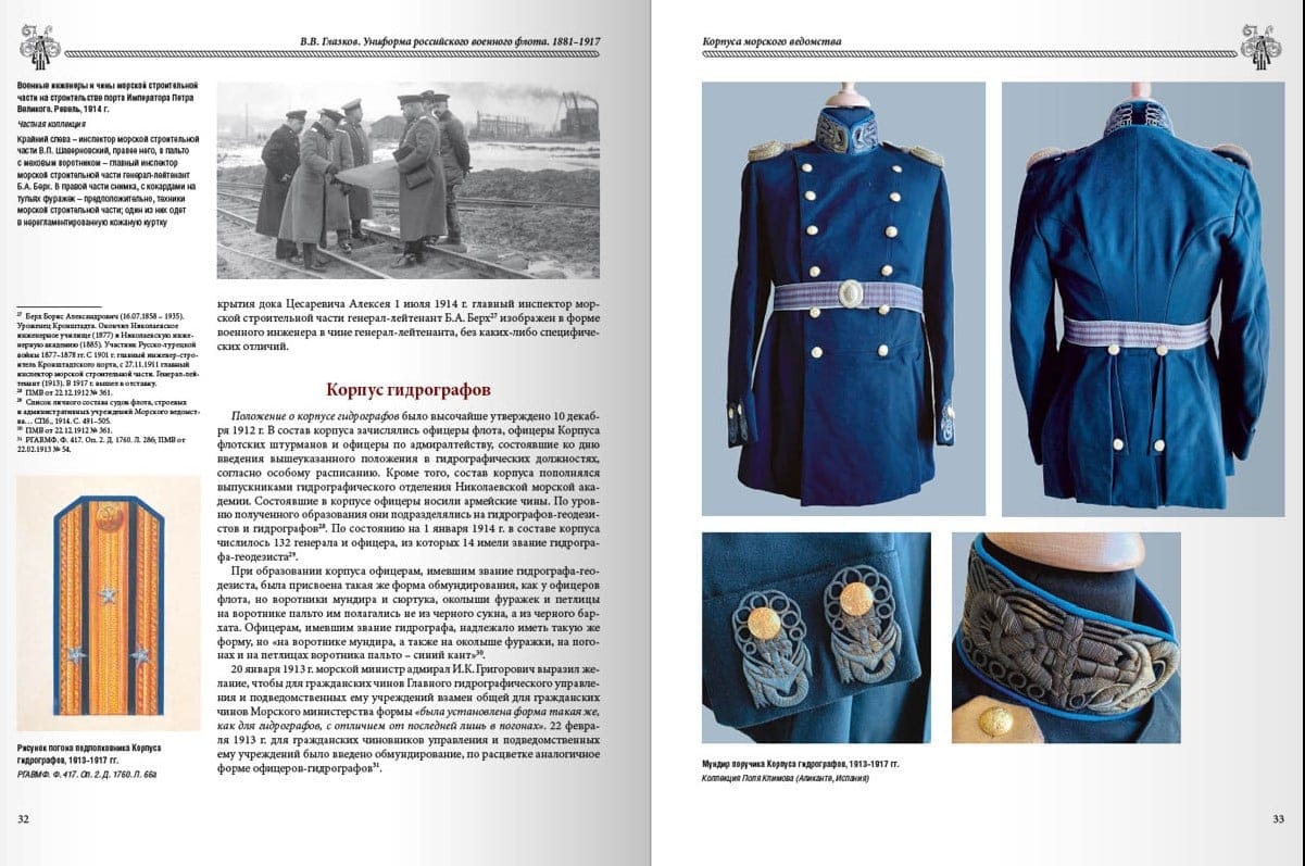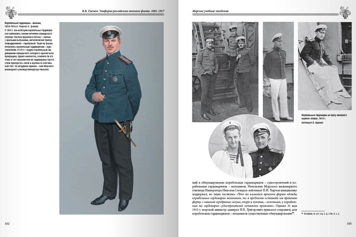 Книга является логическим продолжением книги «Униформа российского военного флота. 1855-1881». Во второй том вошли сведения о форме корпусов морского ведомства, военно-морских учебных заведений, кондукторов флота и корабельных гардемаринов, некоторых других категорий военно-морских чинов, главы, посвященные личному оружию и снаряжению военных моряков, а также описания правил ношения различных форм обмундирования, орденов и знаков отличия. При написании книги применялись нормативные документы морского ведомства, справочная литература того времени, а также архивные материалы.