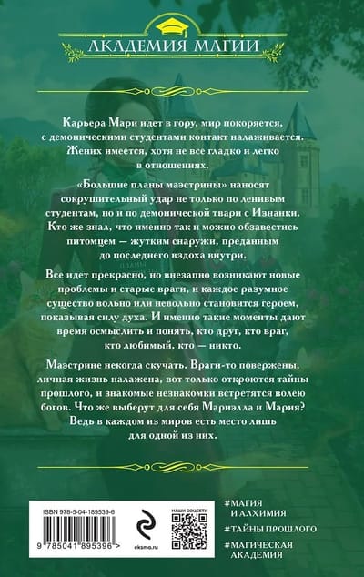 Карьера Мари идет в гору, мир покоряется, с демоническими студентами контакт налаживается. Жених имеется, хотя не все гладко и легко в отношениях. «Большие планы маэстрины» наносят сокрушительный удар не только по ленивым студентам, но и по демонической твари с Изнанки. Кто же знал, что именно так и можно обзавестись питомцем — жутким снаружи, преданным до последнего вздоха внутри. Все идет прекрасно, но внезапно возникают новые проблемы и старые враги, и каждое разумное существо вольно или невольно становится героем, показывая силу духа. И именно такие моменты дают время осмыслить и понять, кто друг, кто враг, кто любимый, кто — никто. Маэстрине некогда скучать. Враги-то повержены, личная жизнь налажена, вот только откроются тайны прошлого, и знакомые незнакомки встретятся волею богов. Что же выберут для себя Мариэлла и Мария? Ведь в каждом из миров есть место лишь для одной из них.