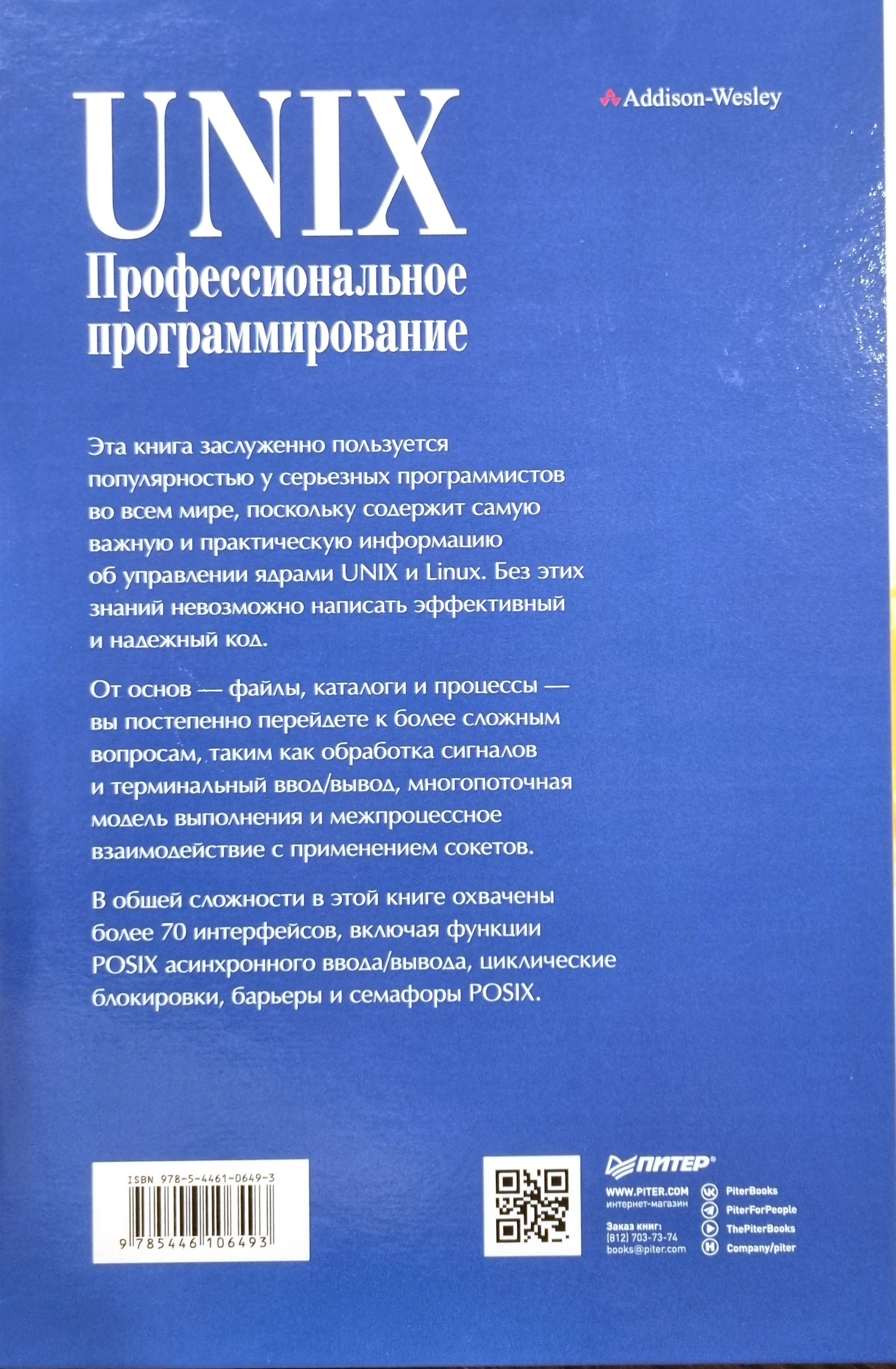 Эта книга заслуженно пользуется популярностью у серьезных программистов во всем мире, поскольку содержит самую важную и практическую информацию об управлении ядрами UNIX и Linux. Без этих знаний невозможно написать эффективный и надежный код. От основ - файлы, каталоги и процессы - вы постепенно перейдете к более сложным вопросам, таким как обработка сигналов и терминальный ввод/вывод, многопоточная модель выполнения и межпроцессное взаимодействие с применением сокетов. В общей сложности в этой книге охвачены более 70 интерфейсов, включая функции POSIX асинхронного ввода/вывода, циклические блокировки, барьеры и семафоры POSIX. 3-е издание.