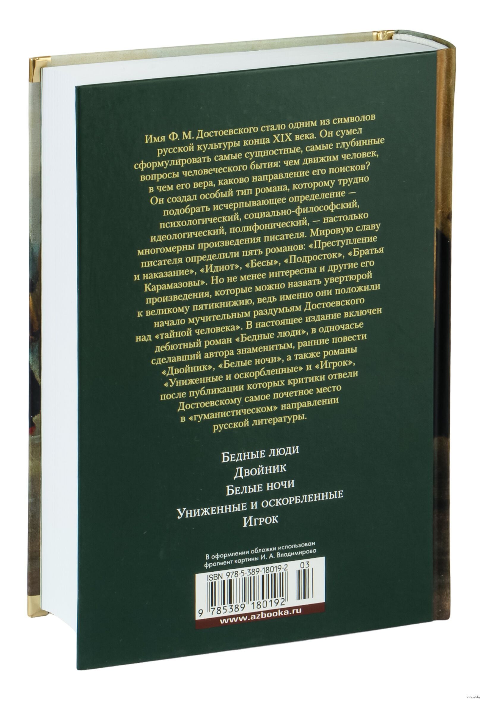 Имя Ф. М. Достоевского стало одним из символов русской культуры конца XIX века. Он сумел сформулировать самые сущностные, самые глубинные вопросы человеческого бытия: чем движим человек, в чем его вера, каково направление его поисков? Он создал особый тип романа, которому трудно подобрать исчерпывающее определение — психологический, социально-философский, идеологический, полифонический, — настолько многомерны произведения писателя. Мировую славу писателя определили пять романов: «Преступление и наказание», «Идиот», «Бесы», «Подросток», «Братья Карамазовы». Но не менее интересны и другие его произведения, которые можно назвать увертюрой к великому пятикнижию, ведь именно они положили начало мучительным раздумьям Достоевского над «тайной человека». В настоящее издание включен дебютный роман «Бедные люди», в одночасье сделавший автора знаменитым, ранние повести «Двойник», «Белые ночи», а также романы «Униженные и оскорбленные» и «Игрок», после публикации которых критики отвели Достоевскому самое почетное место в «гуманистическом» направлении русской литературы.