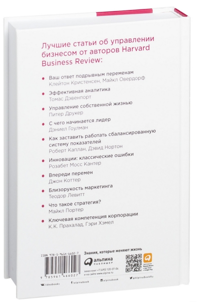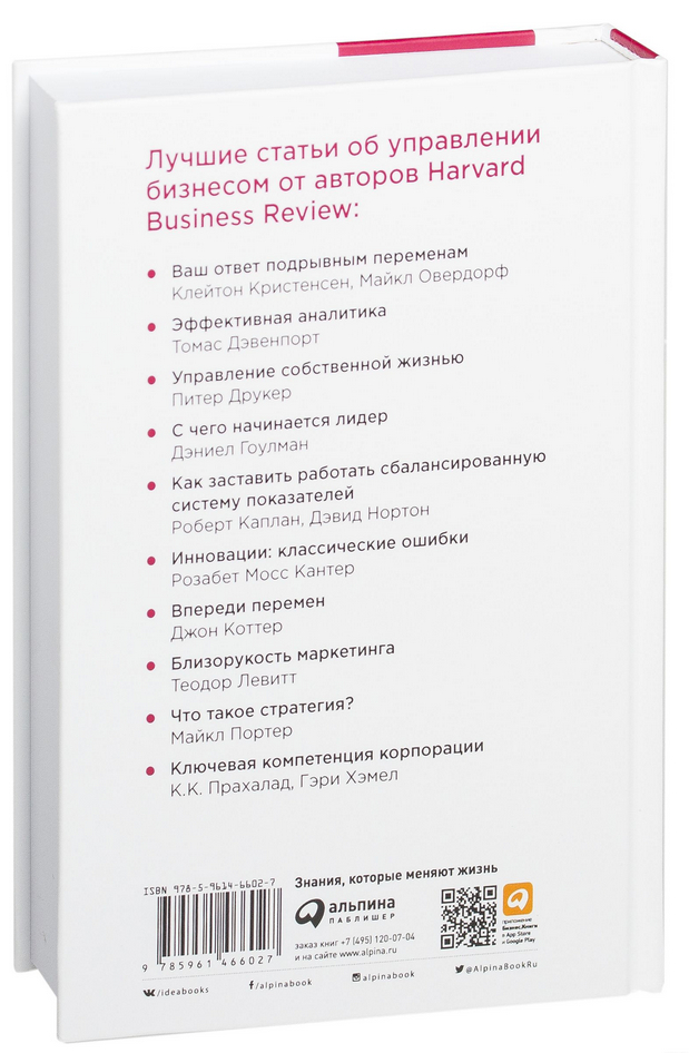 Для нее из сотен статей журнала редакторы HBR отобрали те, в которых влиятельные бизнес-эксперты рассказывают о том, как следует внедрять инновации в управление бизнесом, о роли руководителя во времена болезненных перемен; какие данные помогут распознать потребности клиента и улучшить свой продукт; какие вопросы должен себе задавать каждый хороший руководитель и что ему следует делать, чтобы подчиненные были эффективны и мотивированы на достижение лучших результатов.
