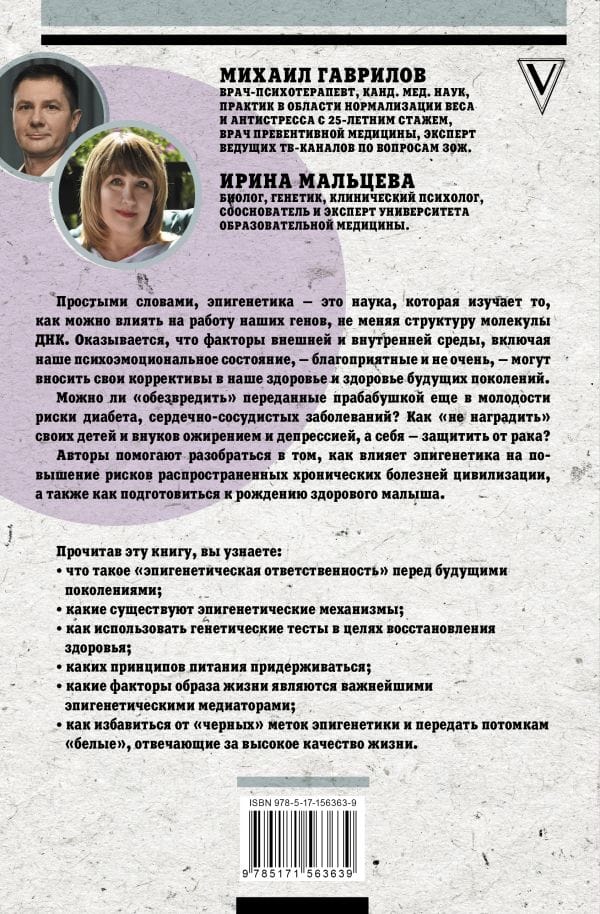 Михаил Гаврилов — врач-психотерапевт, канд. мед. наук, практик в области нормализации веса и антистресса с 25-летним стажем, врач превентивной медицины, эксперт ведущих ТВ-каналов по вопросам ЗОЖ.Ирина Мальцева — биолог, генетик, клинический психолог, сооснователь и эксперт университета образовательной медицины.Простыми словами, эпигенетика — это наука, которая изучает то, как можно влиять на работу наших генов, не меняя структуру молекулы ДНК. Оказывается, что факторы внешней и внутренней среды, включая наше психоэмоциональное состояние, — благоприятные и не очень, — могут вносить свои коррективы в наше здоровье и здоровье будущих поколений.Можно ли «обезвредить» переданные прабабушкой еще в молодости риски диабета, сердечно-сосудистых заболеваний? Как «не наградить» своих детей и внуков ожирением и депрессией, а себя — защитить от рака?Авторы помогают разобраться в том, как влияет эпигенетика на повышение рисков распространенных хронических болезней цивилизации, а также подготовиться к рождению здорового малыша.