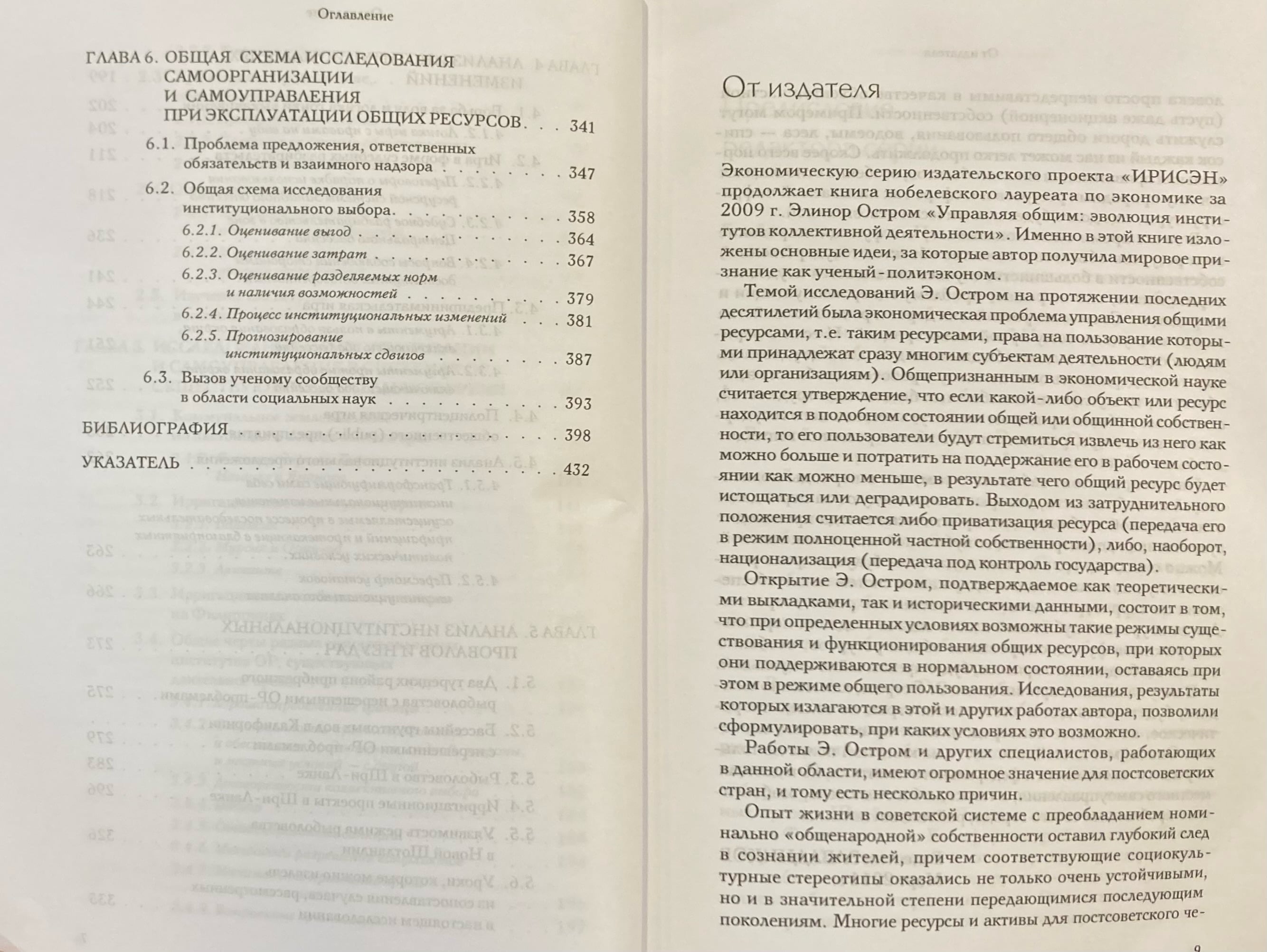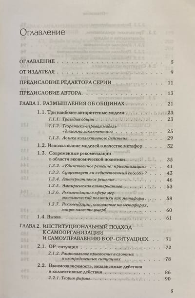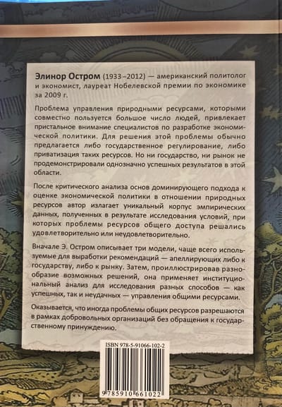 Проблема управления природными ресурсами, которыми совместно пользуется большое число людей, привлекает пристальное внимание специалистов по разработке экономической политики. Для решения этой проблемы обычно предлагается либо государственное регулирование, либо приватизация таких ресурсов. Но ни государство, ни рынок не продемонстрировали однозначно успешных результатов в этой области. После критического анализа основ доминирующего подхода к оценке экономической политики в отношении природных ресурсов автор излагает уникальный корпус эмпирических данных, полученных в результате исследования условий, при которых проблемы ресурсов общего доступа решались удовлетворительно или неудовлетворительно. Вначале Э. Остром описывает три модели, чаще всего используемые для выработки рекомендаций — апеллирующих либо к государству, либо к рынку. Затем, проиллюстрировав разнообразие возможных решений, она применяет институциональный анализ для исследования разных способов — как успешных, так и неудачных — управления общими ресурсами. Оказывается, что иногда проблемы общих ресурсов разрешаются в рамках добровольных организаций без обращения к государственному принуждению. В 2009 г. за свои исследования автор получила Нобелевскую премию по экономике.