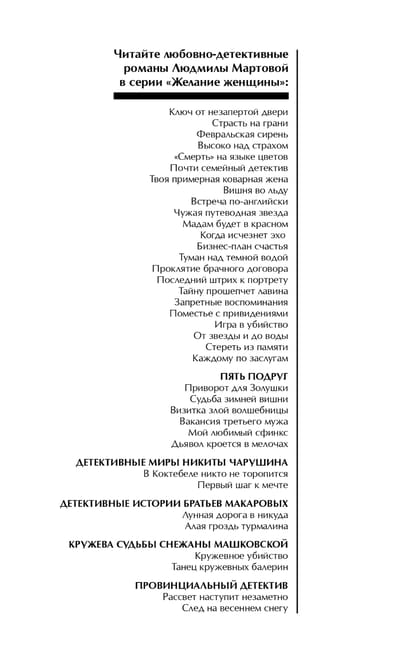 Увлекательность, легкий стиль, узнаваемые женские образы — отличительные черты романов Людмилы Мартовой. На фоне захватывающей детективной интриги автор в легкой доступной форме непринужденно разбирает непростые житейские ситуации, в которых может оказаться любая читательница, и ненавязчиво подсказывает пути выхода из них.