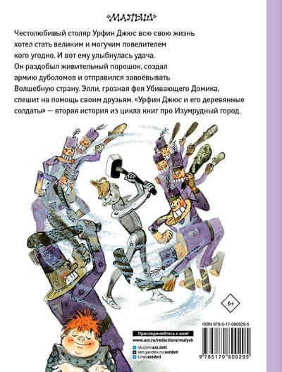 «Урфин Джюс и его деревянные солдаты» — вторая сказочная повесть из цикла книг А. Волкова про Изумрудный город. В Волшебной стране случилась беда! Злой столяр Урфин Джюс раздобыл живительный порошок, выстругал себе армию дуболомов и отправился завоёвывать Изумрудный город и всю страну. Страшила, Железный Дровосек и Храбрый Лев не могут прогнать злодея. Элли вместе с дядей Чарли Блеком отправляется на помощь своим верным друзьям. Художнику книги Леониду Владимирскому в 2020 году исполняется 100 лет. Автор книги Александр Волков считал его иллюстрации лучшими.