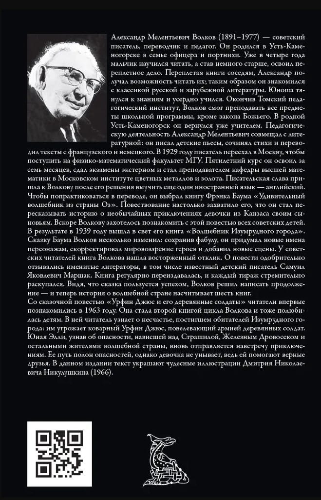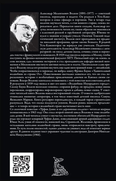 Александр Мелентьевич Волков (1891–1977) — советский писатель, переводчик и педагог. Он родился в Усть-Каменогорске в семье офицера и портнихи. Уже в четыре года мальчик научился читать, а став немного старше, освоил переплетное дело. Переплетая книги соседям, Александр получал возможность читать их; таким образом он знакомился с классикой русской и зарубежной литературы. Юноша тянулся к знаниям и усердно учился. Окончив Томский педагогический институт, Волков смог преподавать все предметы школьной программы, кроме закона Божьего. В родной Усть-Каменогорск он вернулся уже учителем. Педагогическую деятельность Александр Мелентьевич совмещал с литературной: он писал детские пьесы, сочинял стихи и переводил тексты с французского и немецкого. В 1929 году писатель переехал в Москву, чтобы поступить на физико-математический факультет МГУ. Пятилетний курс он освоил за семь месяцев, сдал экзамены экстерном и стал преподавателем кафедры высшей математики в Московском институте цветных металлов и золота. Писательская слава пришла к Волкову после его решения выучить еще один иностранный язык — английский. Чтобы попрактиковаться в переводе, он выбрал книгу Фрэнка Баума «Удивительный волшебник из страны Оз». Повествование настолько захватило его, что он стал пересказывать историю о необычайных приключениях девочки из Канзаса своим сыновьям. Вскоре Волкову захотелось познакомить с этой повестью всех советских детей. В результате в 1939 году вышла в свет его книга «Волшебник Изумрудного города». Сказку Баума Волков несколько изменил: сохранив фабулу, он придумал новые имена персонажам, скорректировал мировоззрение героев и добавил новые сцены. У советских читателей книга Волкова нашла восторженный отклик. О повести одобрительно отзывались именитые литераторы, в том числе известный детский писатель Самуил Яковлевич Маршак. Книга регулярно переиздавалась, и каждый тираж стремительно раскупался. Видя, что сказка пользуется успехом, Волков решил написать продолжение — и теперь история о волшебной стране насчитывает шесть книг.