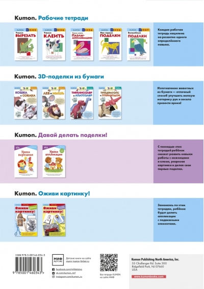 Этот сборник заданий-игр - продолжение серии «Давай делать поделки!», посвященной методике индивидуального обучения KUMON. Вырезание и приклеивание простых фигур поможет ребёнку отработать навыки работы с ножницами и клеем. Сначала ему предстоит заклеивать белые «пятна» на картинках, затем - восстанавливать рисунки, составляя их из деталей. Выполняя такие упражнения, малыш будет развивать мелкую моторику рук, концентрацию внимания, усидчивость и умение принимать решения. Завершающим этапом будет создание классной поделки - книжки с картинками.