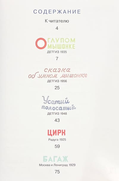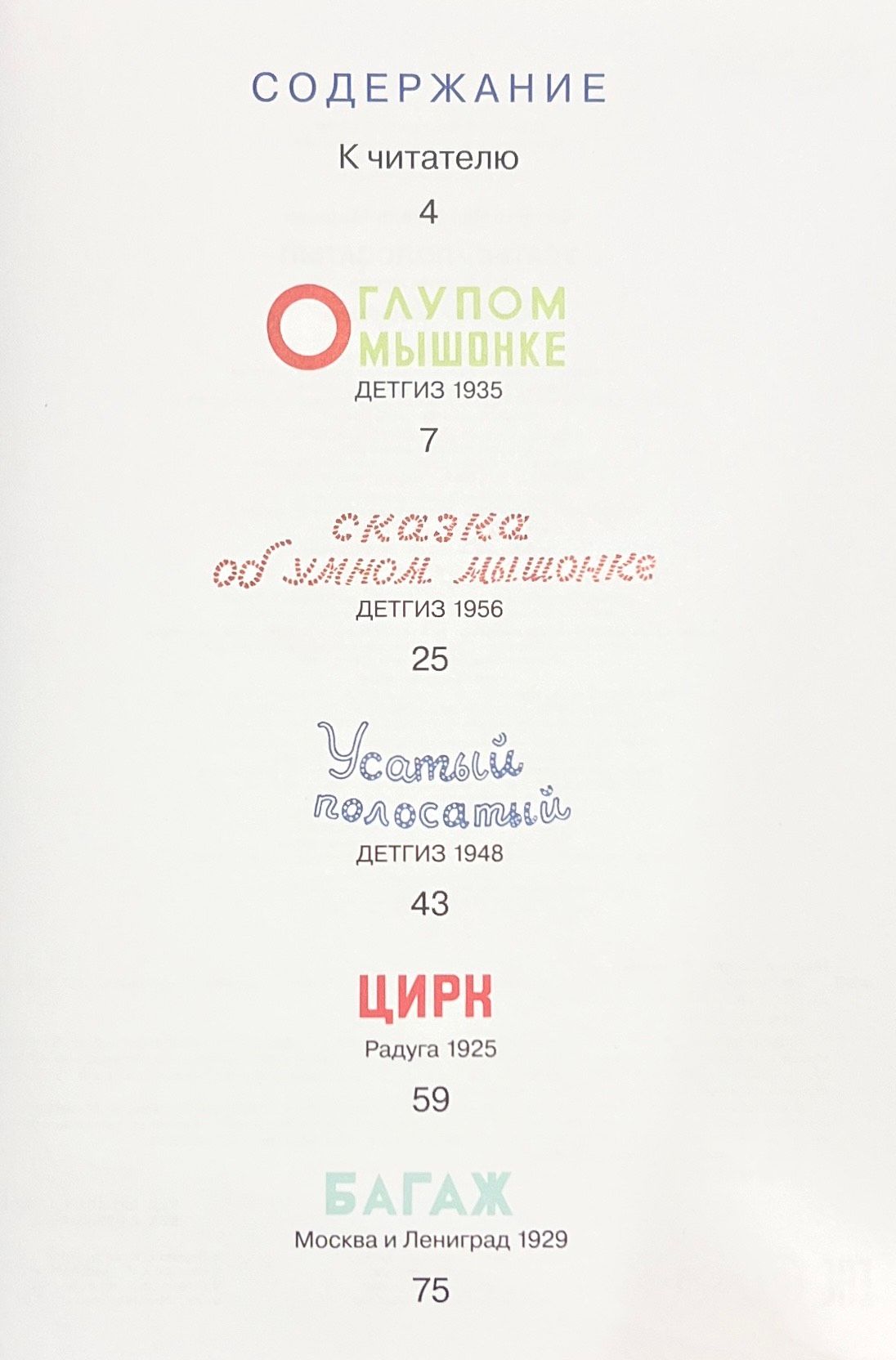В сборник «Усатый‑полосатый» вошли книжки, которые когда‑то давно издавались отдельными брошюрами — книжки с известными сказками и стихами С. Маршака («Сказка о глупом мышонке», «Сказка об умном мышонке», «Усатый‑полосатый», «Цирк» и «Багаж») и иллюстрациями знаменитого художника В. Лебедева. В сборник вошли первые варианты текстов. Для дошкольного возраста.