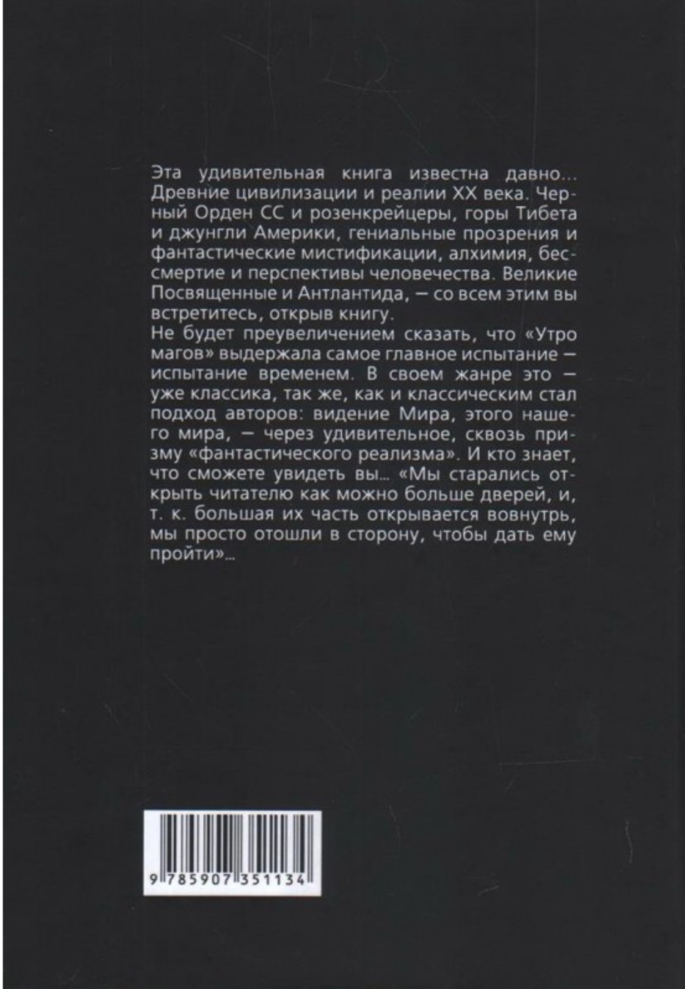Эта удивительная книга известна давно... Древние цивилизации и реалии XX века. Черный Орден СС и розенкрейцеры, горы Тибета и джунгли Америки, гениальные прозрения и фантастические мистификации, алхимия, бессмертие и перспективы человечества. Великие Посвященные и Антлантида, — со всем этим вы встретитесь, открыв книгу. Не будет преувеличением сказать, что «Утро магов» выдержала самое главное испытание — испытание временем. В своем жанре это — уже классика, так же, как и классическим стал подход авторов: видение Мира, этого нашего мира, — через удивительное, сквозь призму «фантастического реализма». И кто знает, что сможете увидеть вы... «Мы старались открыть читателю как можно больше дверей, и, т к. большая их часть открывается вовнутрь, мы просто отошли в сторону, чтобы дать ему пройти»...