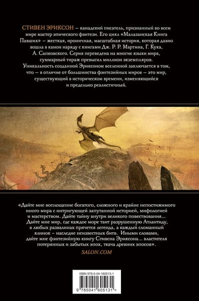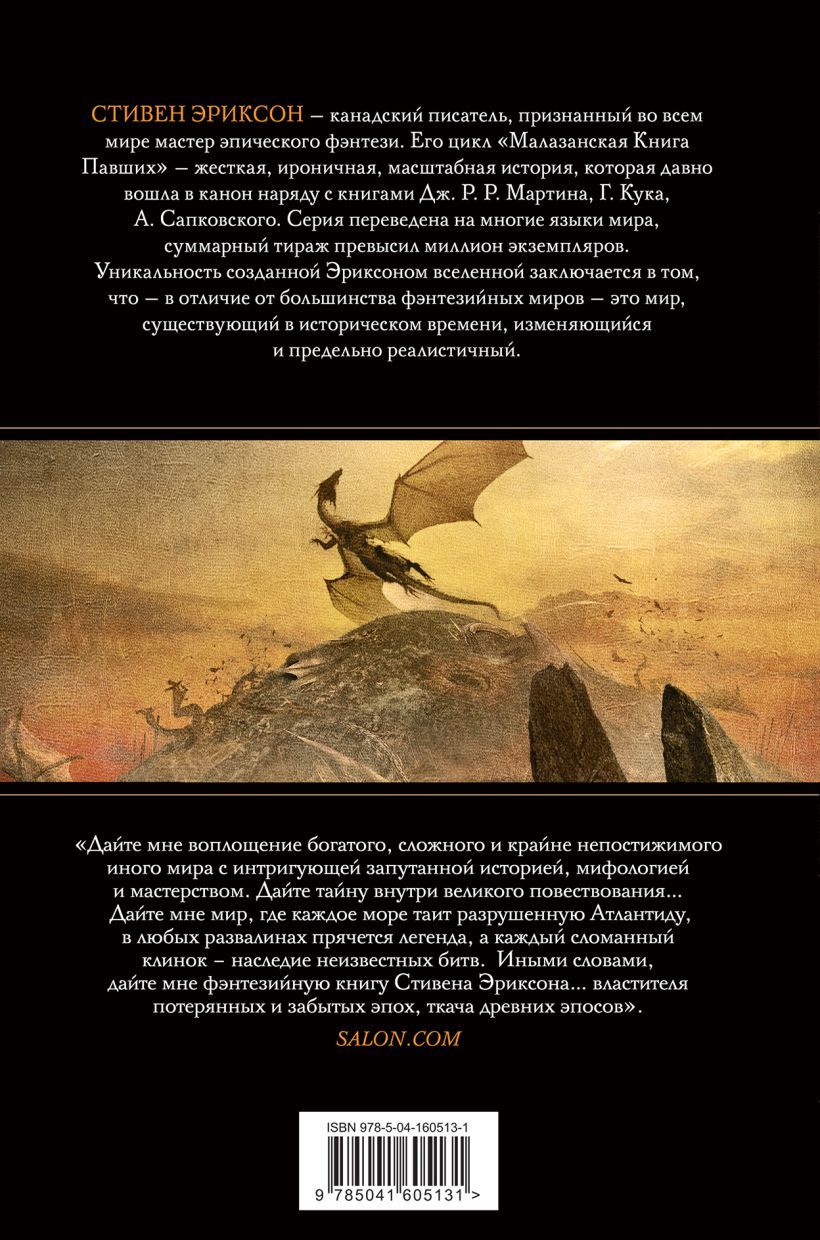 Кульминация эпической «Малазанской книги павших» определит будущих властителей мира. Охотники за костями движутся в Коланс. Армия на грани мятежа. Адьюнкт Тавор же хочет бросить вызов богам – если собственные солдаты не убьют ее первыми. Форкрул Ассейлы, Законные инквизиторы, используя чудовищную силу готовятся очистить человечество, чтобы построить мир заново. А три Древних Бога готовятся освободить Корабас, Отатаралового дракона из вековечного плена. Она восстанет как сила разрушения, против которой не устоит ни один смертный. Эпический роман о войне, мести, неминуемом апокалипсисе и обновлении. Последняя глава в монументальной саге Стивена Эриксона.