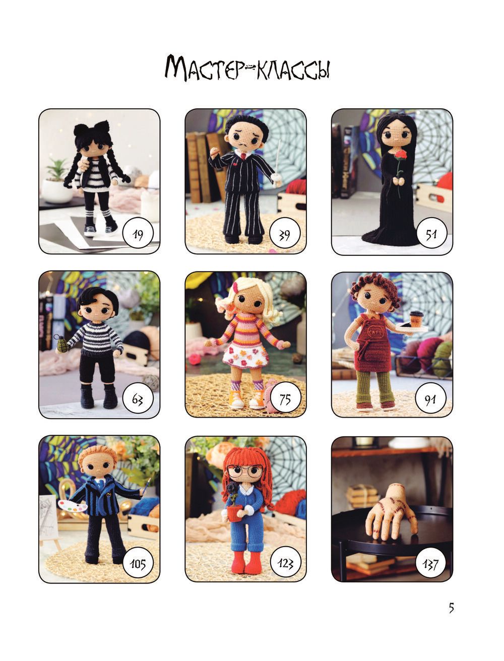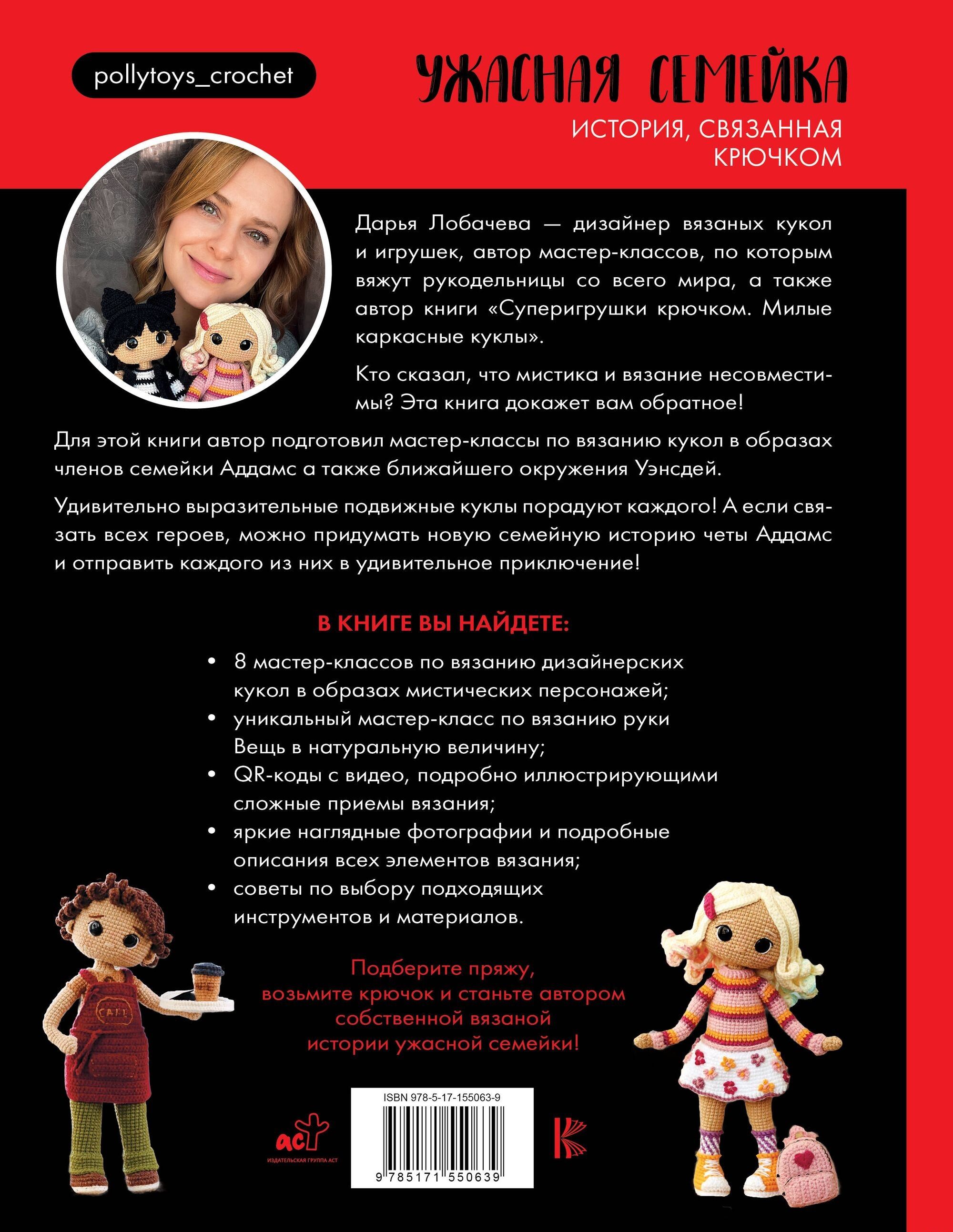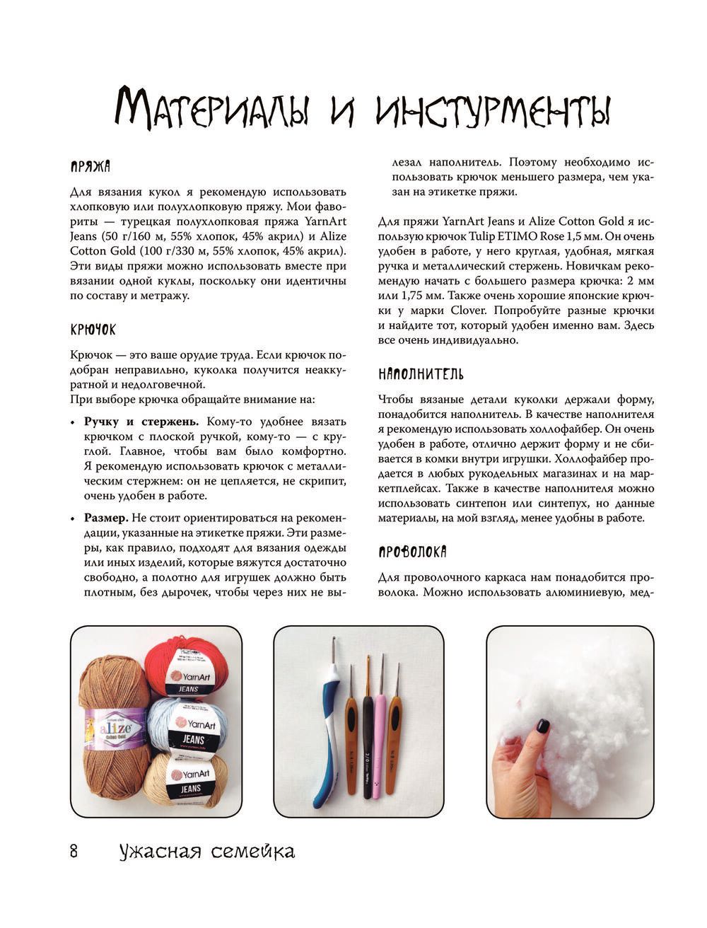 Для книги «Ужасная семейка. Вязанная история крючком» автор подготовил мастер-классы по вязанию кукол в образах членов семейки Аддамс а также ближайшего окружения Уэнсдей.