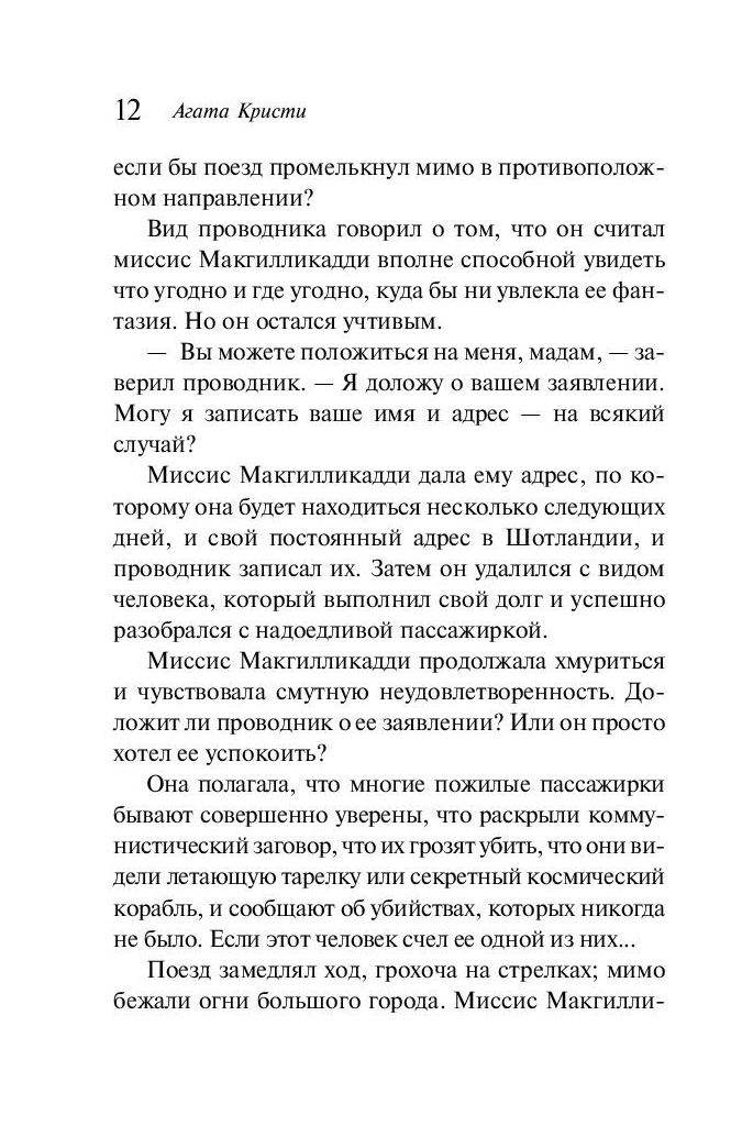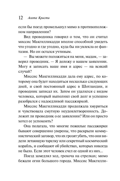 Мисс Макгилликадди, пожилая дама, рассказывает своей подруге, что видела из окна поезда во время стоянки ужасную сцену: в окне вагона встречного поезда мужчина задушил молодую женщину. Поезда разъехались, а мисс Макгилликадди, чтобы понять, галлюцинация это или нет, остается рассчитывать только на помощь подруги. Но подруга-то не простая, ведь зовут ее – мисс Джейн Марпл!