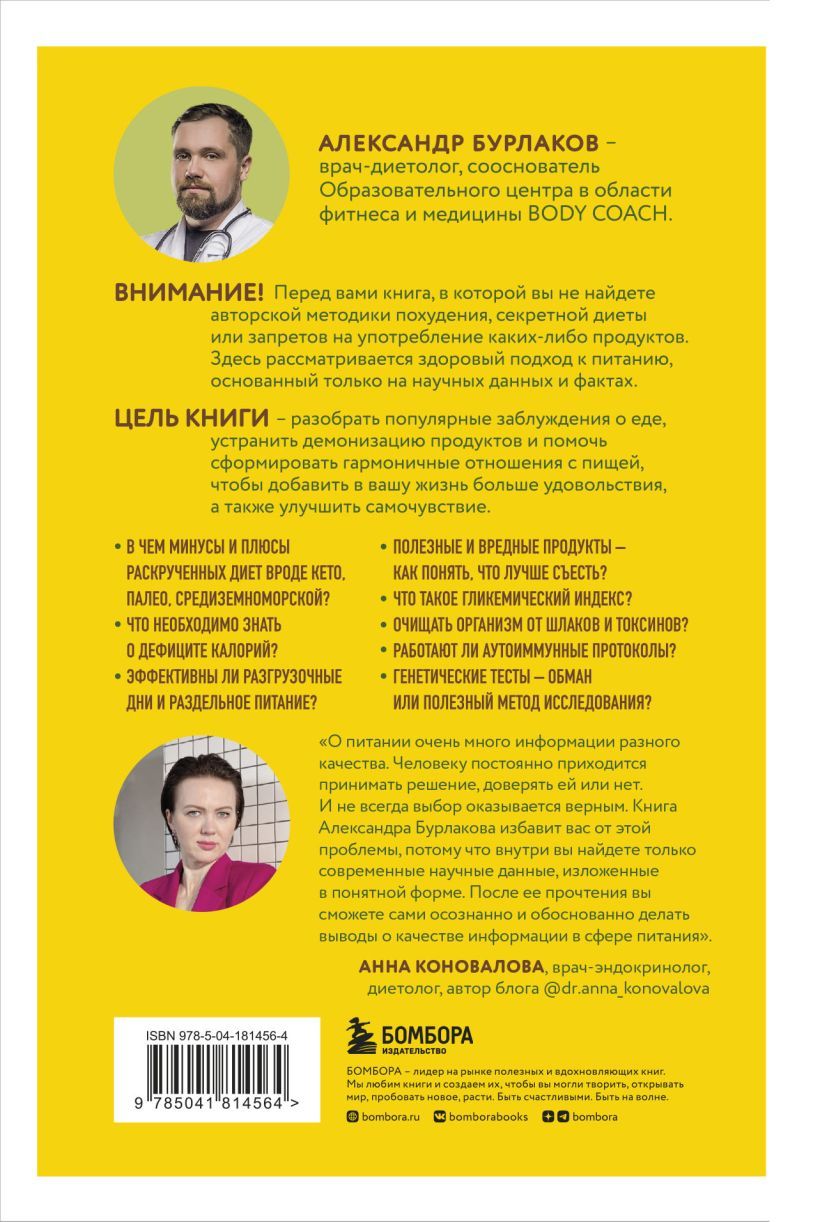 Автор книги, Александр Бурлаков,, врач-диетолог, автор медицинского блога @dr.burlakov и cооснователь образовательного центра в области фитнеса и медицины BODY COACH, рассматривает рацион с точки зрения доказательной медицины и современной науки. Цель книги — разобрать популярные заблуждения о еде, устранить демонизацию продуктов и помочь сформировать гармоничные отношения с пищей, чтобы добавить в вашу жизнь больше удовольствия, а также улучшить самочувствие. И в этом вам поможет Александр Бурлаков и его книга.