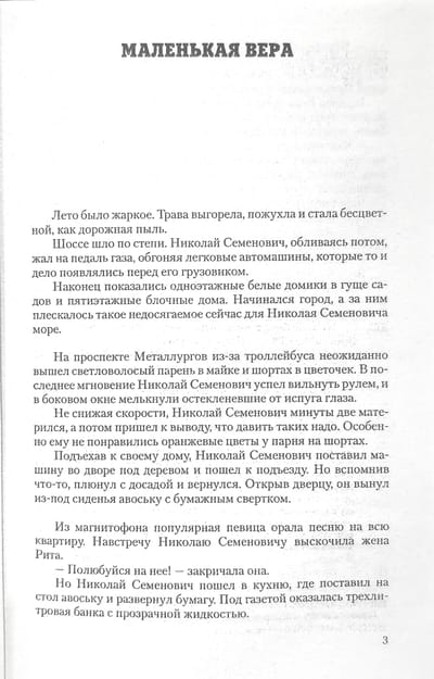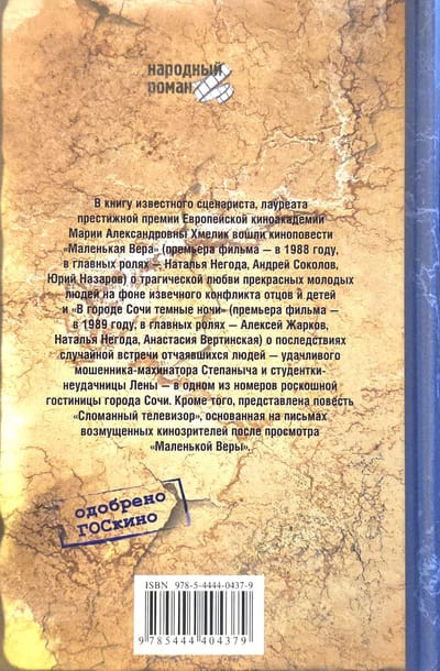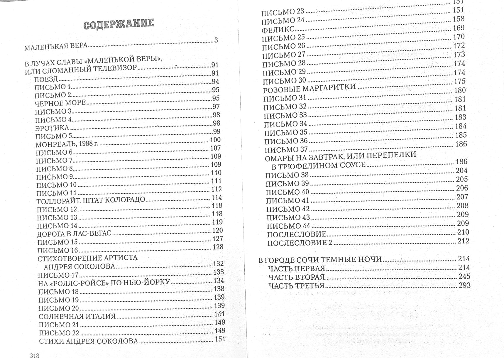В книгу известного сценариста, лауреата престижной премии Европейской киноакадемии Марии Александровны Хмелик вошли киноповести «Маленькая Вера» (премьера фильма — в 1988 году, в главных ролях — Наталья Негода, Андрей Соколов, Юрий Назаров) о трагической любви прекрасных молодых людей на фоне извечного конфликта отцов и детей и «В городе Сочи темные ночи» (премьера фильма — в 1989 году, в главных ролях — Алексей Жарков, Наталья Негода, Анастасия Вертинская) о последствиях случайной встречи отчаявшихся людей — удачливого мошенника-махинатора Степаныча и студентки-неудачницы Лены — в одном из номеров роскошной гостиницы города Сочи.
