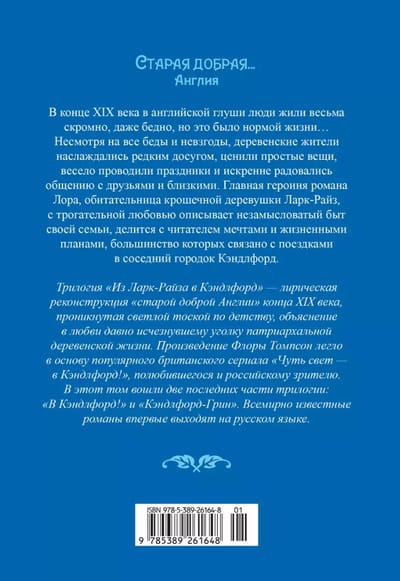 Автобиографическая трилогия «Из Ларк-Райз в Кэндлфорд» — ностальгическая ода, воспевающая жизнь провинциальной Англии Викторианской эпохи, рассказанная от лица девочки Лоры, выросшей в деревушке Ларк-Райз на севере Оксфордшира, а затем, еще подростком, устроившейся работать в почтовое отделение в близлежащем городке Кэндлфорд-Грин. Эти полулирические-полудокументальные воспоминания очаровывают искренностью повествования и простотой деревенских нравов, порой кажущихся наивными, и от этого еще более трогательных. В этот том вошли вторая и третья части трилогии.