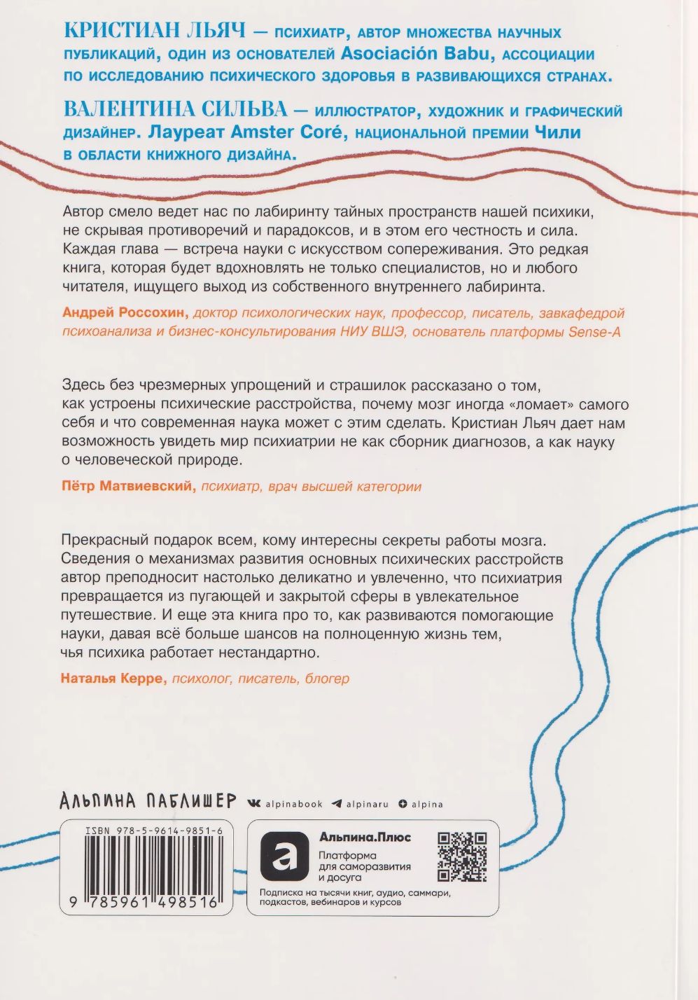 По оценкам специалистов, более миллиарда человек в мире страдают от самых разных психических расстройств: тревоги, депрессии, шизофрении, биполярного расстройства, посттравматического стресса, расстройств пищевого поведения и др. Испанский психиатр Кристиан Льяч просто и понятно рассказывает о том, что эти расстройства из себя представляют, что чувствуют люди, им подверженные, каковы основные симптомы и методы лечения таких расстройств. Автор также знакомит читателей с историей развития психиатрии как науки, дает краткие сведения об анатомии и физиологии мозга, о важных ролях биологии и генетики в формировании нервной системы человека, пишет о влиянии социума на развитие психики и о важности правильного отношения к пациентам с психическими расстройствами. Иллюстрации Валентины Сильва помогают закрепить в памяти важную информацию.