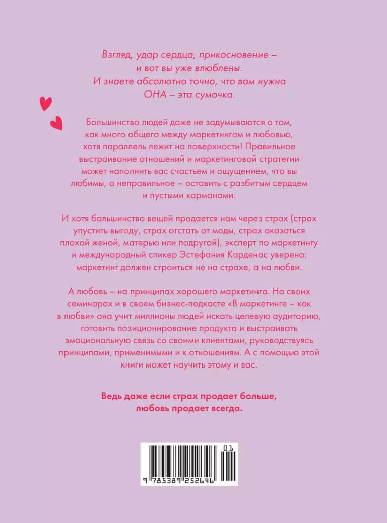 И хотя большинство вещей продается нам через страх (страх упустить выгоду, страх отстать от моды, страх оказаться плохой женой, матерью или подругой), эксперт по маркетингу и международный спикер Эстефания Карденас уверена: маркетинг должен строиться не на страхе, а на любви. А любовь – на принципах хорошего маркетинга. На своих семинарах и в своем бизнес-подкасте «В маркетинге – как в любви» она учит миллионы людей искать целевую аудиторию, готовить позиционирование продукта и выстраивать эмоциональную связь со своими клиентами, руководствуясь принципами, применимыми и к отношениям. А с помощью этой книги может научить этому и вас.