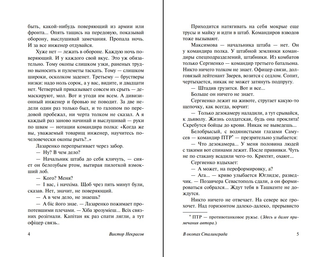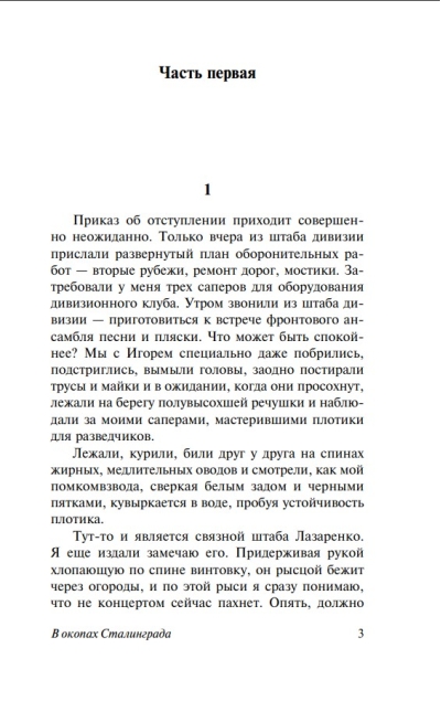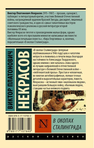 «В окопах Сталинграда» (впервые опубликованная в 1946 году) шла к читателю непросто и появилась в печати лишь благодаря настойчивости Александра Твардовского, однако именно с нее началась слава одного из лучших направлений в отечественной литературе о Великой Отечественной войне — «лейтенантской прозы». Простая и человечная, во многом автобиографичная, полная точных деталей и выразительных характеров, повесть Некрасова — истинный гимн «маленьким людям», выигравшим большую войну, обычным людям, ставшим частью великого подвига.