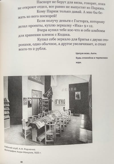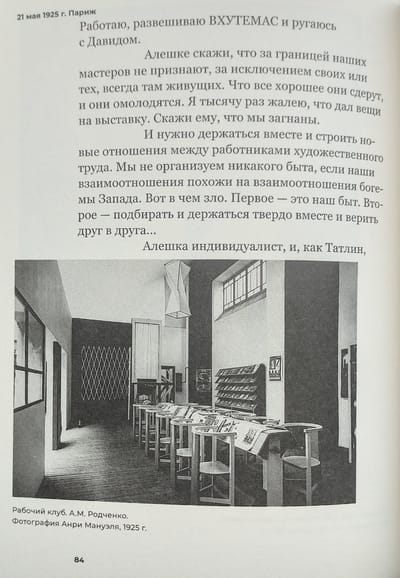В марте 1925 года Родченко выехал в Париж для работы над оформлением советского раздела Международной выставки декоративного искусства и художественной промышленности. Он писал домой почти ежедневно. Дома Степанова собирала письма, подшивала их в специальную тетрадь. В № 1 журнала «Новый ЛЕФ» за 1927 год была опубликована часть этих писем. В те годы лефовцы-литераторы отстаивали принцип «документальной прозы», то есть максимально фактографическое описание происходящего (принцип интервью, дневника, пачки документов). Предельная откровенность писем Родченко им импонировала. Это был взгляд художника нового типа, конструктивиста, дизайнера одновременно и на Париж, и на Москву со стороны.
