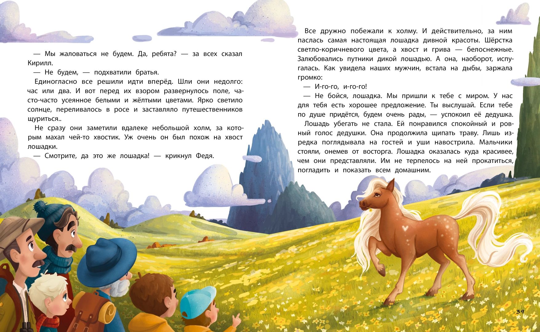И вот однажды семья решает завести домашнее животное. Да не простое, а обязательно большое, доброе и выносливое. Выбор падает на лошадку. Но где её взять? Дедушка Савелий предлагает отправиться в лес и приручить дикое животное. По дороге путники мокнут под дождём, сталкиваются с «‎настоящим»‎ волком, находят клад с драгоценными камнями и, конечно, встречают нового друга - лошадку. Добрая книга от Аллы Родионовой рассказывает о силе семейных традиций, показывает ценность взаимовыручки, учит прислушиваться к мнению близких и договариваться друг с другом. Рекомендована для детей от пяти лет, а также их родителей.