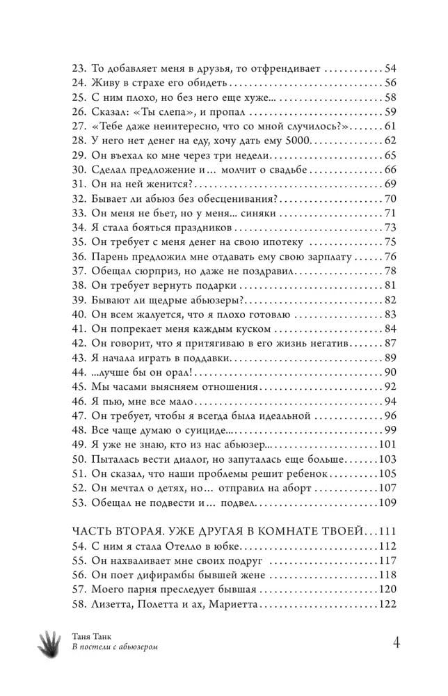 Таня Танк, @tanja. tank, автор трилогии «Бойся, я с тобой. Страшная книга о роковых и неотразимых», ведущая блогов об абьюзе в Инстаграме и Живом Журнале: «Разбитые сердца, обманутые надежды, тяжелые расставания... Каждый день читатели присылают мне драматичные исповеди, в которых задают одни и те же вопросы — общие для всех, у кого „сложная“ любовь с „противоречивым“ человеком. В этой книге я собрала и прокомментировала 150 типовых ситуаций из ваших писем. Прямо сейчас открывайте оглавление и ищите свою».