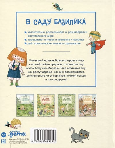 Серия «В саду Базилика» — это познавательные книги для самых маленьких об удивительном мире растений. Бабушка Морковь найдёт ответы на самые разные вопросы своего внука Базилика: могут ли растения любить, как у них появляются дети, какими способностями они обладают и что умеют.