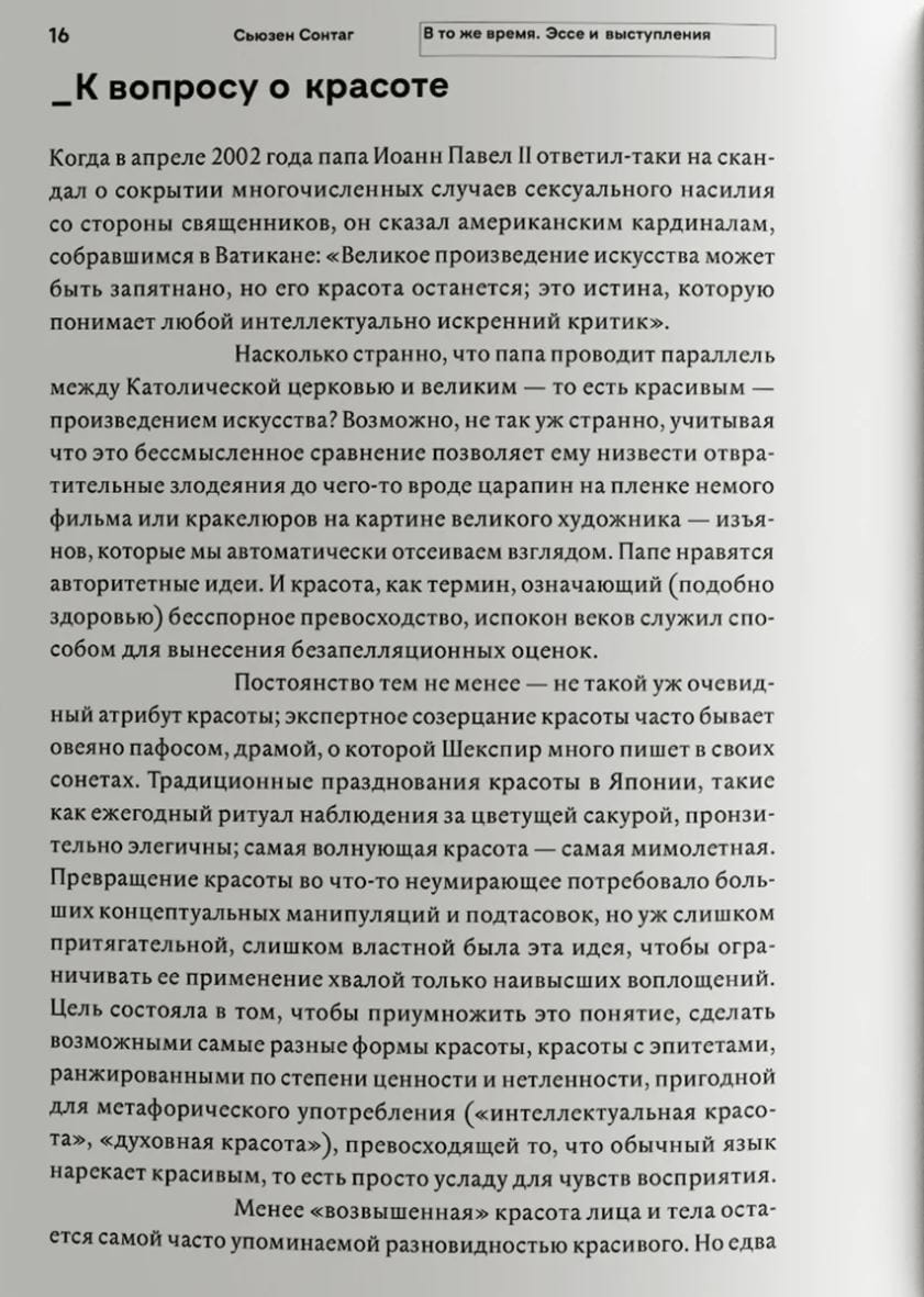 Сборник из шестнадцати эссе и выступлений Сьюзен Сонтаг (1933–2004), подготовленный ею в последние годы жизни, ретроспективно воспринимается как творческое завещание. Рассуждения о красоте, фотографии, художественных поисках Виктора Сержа, Леонида Цыпкина, Анны Банти, Халлдора Лакснесса, о переписке Рильке с Пастернаком и Цветаевой оказываются органически связаны с восприятием трагедии 11 сентября и войны в Ираке, подводя к одной из крупнейших и главных тем американской мыслительницы и писательницы: ответственности и задачам литературы в ХХ веке. Глубокое и созидательное прочтение работ других авторов, верность высоким моральным критериям, многомерные оценки происходящего «везде и одновременно» позволяют считать этот сборник шедевром позднего периода творчества Сонтаг.