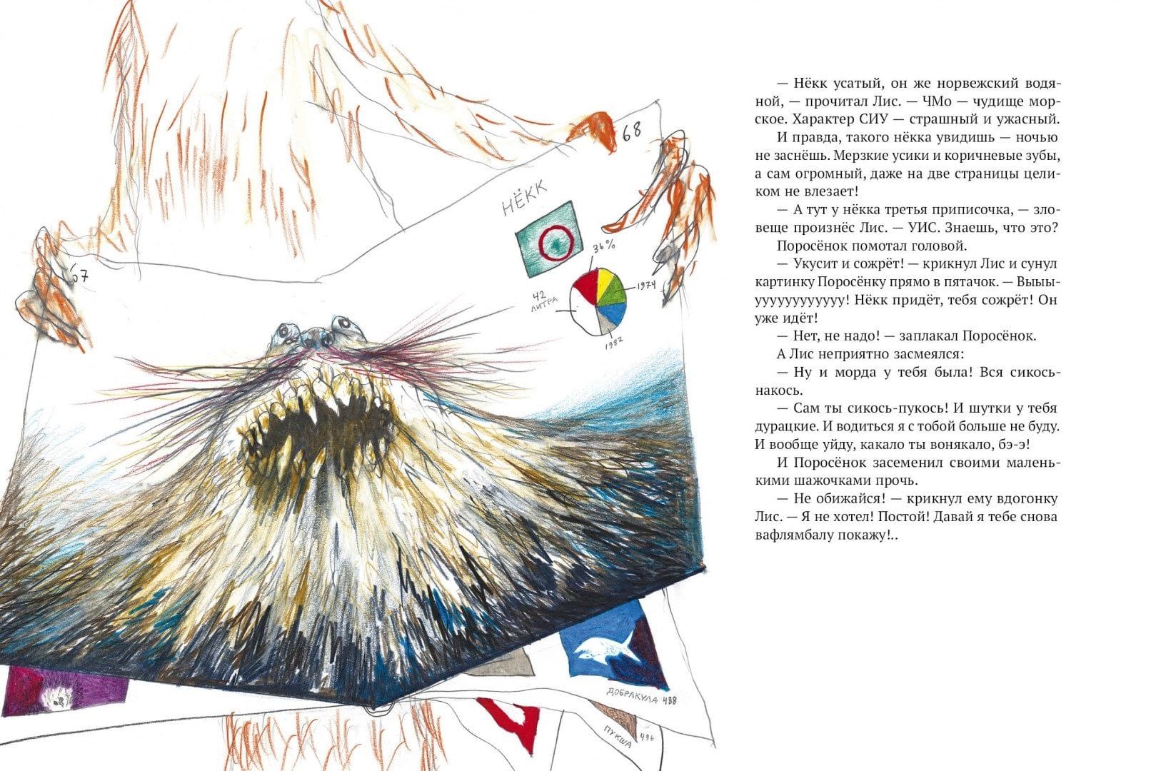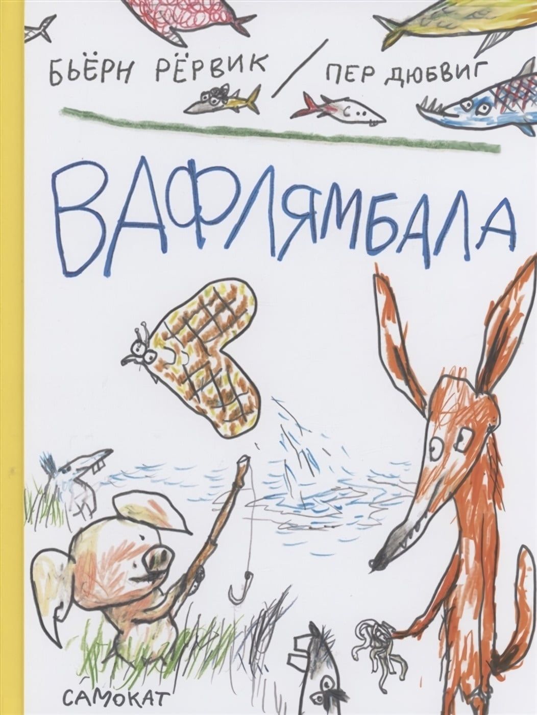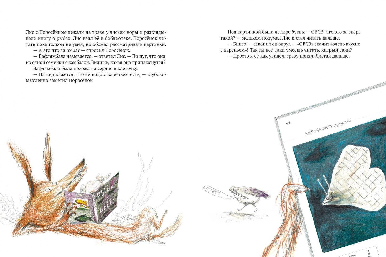 Очередное приключение Лиса и Поросёнка началось с книги о рыбах, которую они рассматривали. Каких только рыб там не было! Горлодёр и двуголавль, ржавчник и карпофель, шилозад и дымойва... Но всех их затмила прекрасная вафлямбала. Похожая на сердце в клеточку, аппетитная, как вафля, хоть с вареньем ешь, — как тут устоять! И друзья отправились на рыбалку, надеясь попробовать несравненную вафлямбалу. Что ж, им придётся изрядно потрудиться, чтобы выловить эту рыбку из озера...