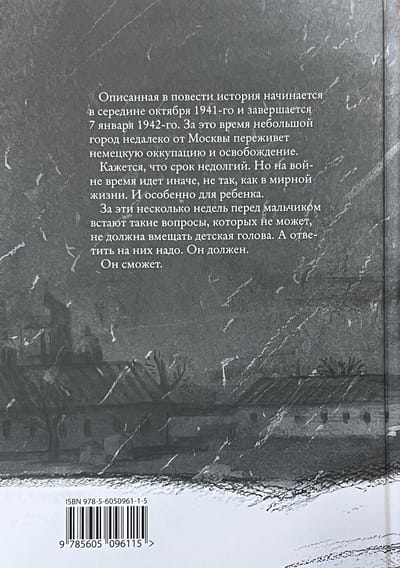 Описанная в повести история начинается в середине октября 1941 и завершается 7 января 1942. За это время небольшой город недалеко от Москвы переживет немецкую оккупацию и освобождение. Кажется, что срок недолгий. Но на войне время идет иначе, не так, как в мирной жизни. И особенно для ребенка. За эти несколько недель перед мальчиком встают такие вопросы, которых не может, не должна вмещать детская голова. А ответить на них надо. Он должен. Он сможет.