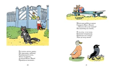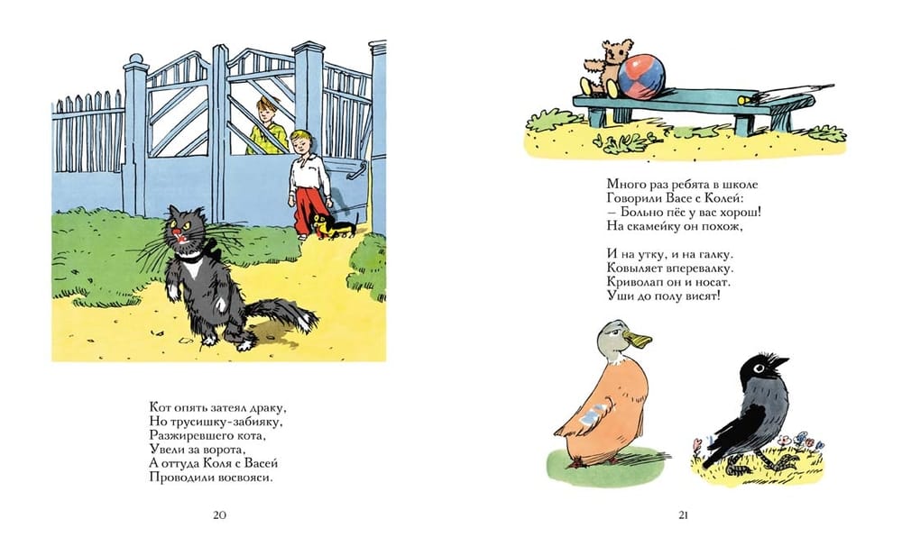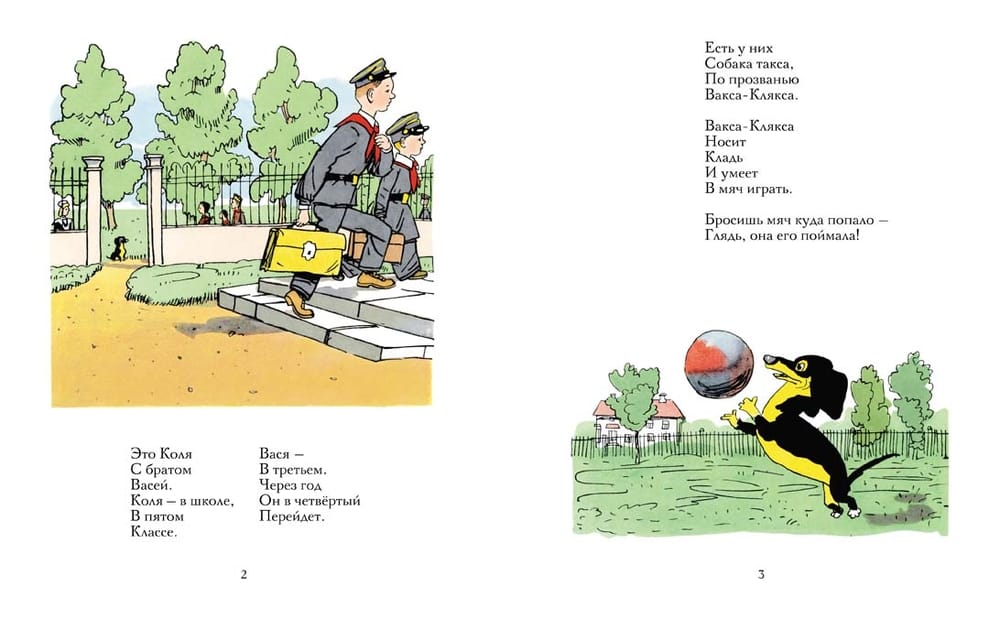 На скамейку он похож И на утку, и на галку, Ковыляет вперевалку. Криволап он и носат, Уши до полу висят. Да ведь это чистопородная такса. Американский писатель Леонард Льюис Левинсон пошутил, что такса – это порода собак определенного размера, примерно в полсобаки в высоту и полторы собаки в длину. А Самуил Маршак сочинил очень веселые и позитивные стихи. Собаку в них зовут Вакса-Клякса. Пес очень предан своим хозяевам, готов бежать за ними на край света, добыть для мальчишек настоящий футбольный мяч и даже вступить в сражение с целой стаей крыс. И все-таки он безобразен или прекрасен? На этот вопрос ответят эксперты на выставке собак. Психологически выразительные и веселые иллюстрации к «Ваксе-Кляксе» создал известный художник, автор образа желтого пушистого Мурзилки, Аминадав Каневский. Его рисунки отличаются живым юмором и комическим преувеличением ситуаций и образов. Они выполнены в излюбленной Каневским манере рисунка пером с акварельной раскраской.