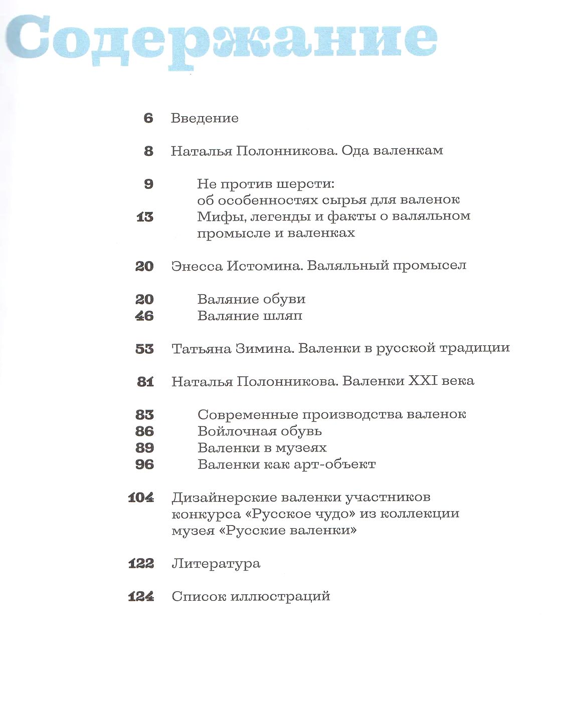 В книге опубликованы исторические фотографии, архивные материалы и экспонаты ряда музеев, что позволит читателю понять технологию изготовления валенок на разных исторических этапах и ознакомиться с разнообразием моделей валяной обуви. Показаны как музейные образцы валяных изделий (самые ранние — фрагменты обуви, датируемые XII−XIV веками), так и современные дизайнерские валенки.