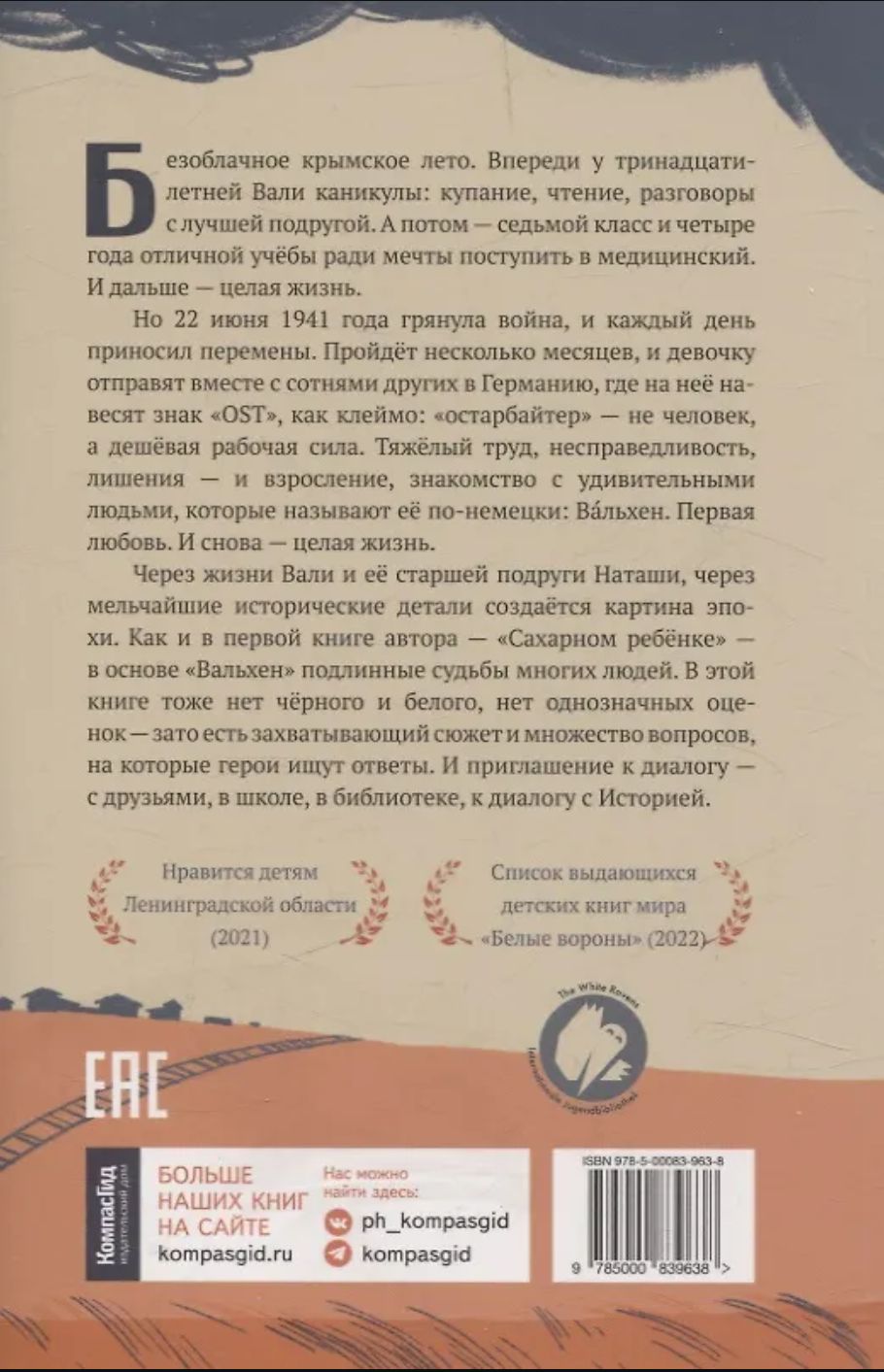Тяжёлый труд, несправедливость, лишения — и взросление, знакомство с удивительными людьми, которые называют её по-немецки: Ва́льхен. Первая любовь. И снова — целая жизнь. Через жизни Вали и её старшей подруги Наташи, через мельчайшие исторические детали создаётся картина эпохи. Как и в первой книге автора — «Сахарном ребёнке» — в основе «Вальхен» подлинные судьбы многих людей. В этой книге тоже нет чёрного и белого, нет однозначных оценок — зато есть захватывающий сюжет и множество вопросов, на которые герои ищут ответы. И приглашение к диалогу — с друзьями, в школе, в библиотеке, к диалогу с Историей «Вальхен» — роман Ольги Громовой, автора одной из главных детских книг XXI века — «Сахарный ребёнок», — выдержавшей уже тринадцать изданий в России и переведённой на десяток языков, от французского до тайского.