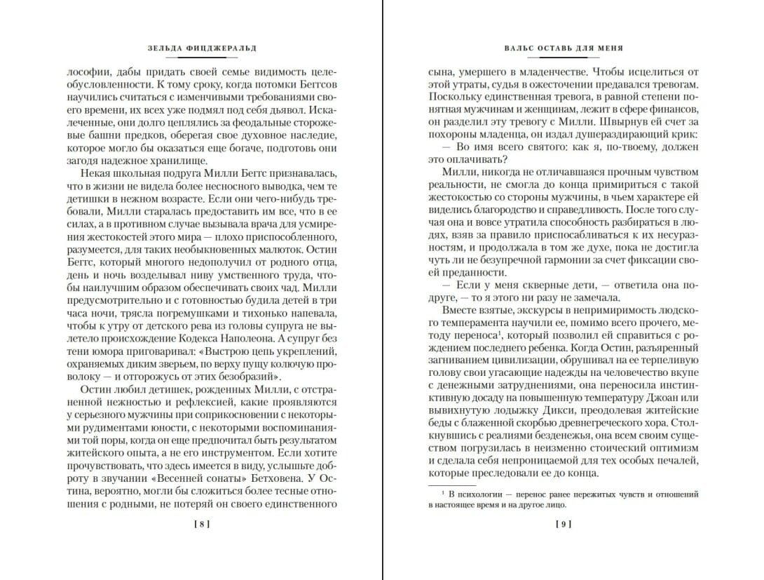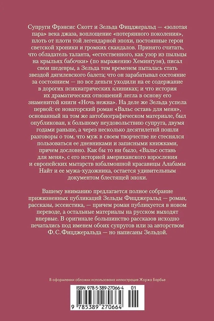 Супруги Фрэнсис Скотт и Зельда Фицджеральд — «золотая пара» века джаза, воплощение «потерянного поколения», плоть от плоти той легендарной эпохи, постоянные герои светской хроники и громких скандалов. Принято считать, что обладатель таланта, «естественного, как узор из пыльцы на крыльях бабочки» (по выражению Хемингуэя), писал свои шедевры, а Зельда тем временем пыталась стать звездой дягилевского балета; что он зарабатывал состояние за состоянием — но все деньги уходили на ее содержание в дорогих психиатрических клиниках; и что история их драматических отношений легла в основу его знаменитой книги «Ночь нежна». На деле же Зельда успела первой: ее новаторский роман «Вальс оставь для меня», основанный на том же автобиографическом материале, был опубликован, к большому неудовольствию супруга, двумя годами раньше, а через несколько десятилетий пошли разговоры о том, что муж в своем творчестве не стеснялся пользоваться ее дневниками и записными книжками, причем дословно. Как бы то ни было, «Вальс оставь для меня», с его историей американского взросления и европейских мытарств взбалмошной красавицы Алабамы Найт и ее мужа-художника, остается удивительным документом блестящей эпохи.