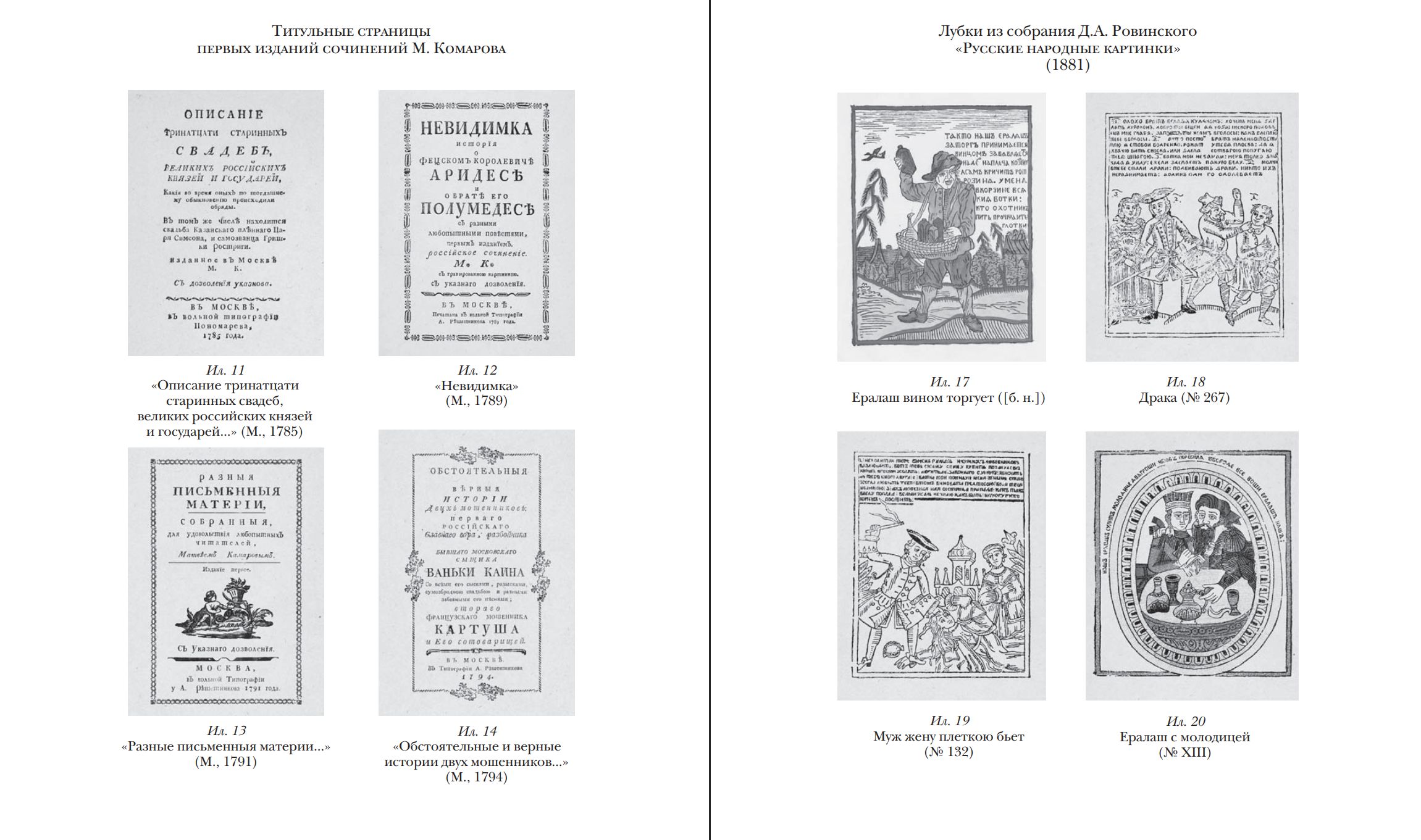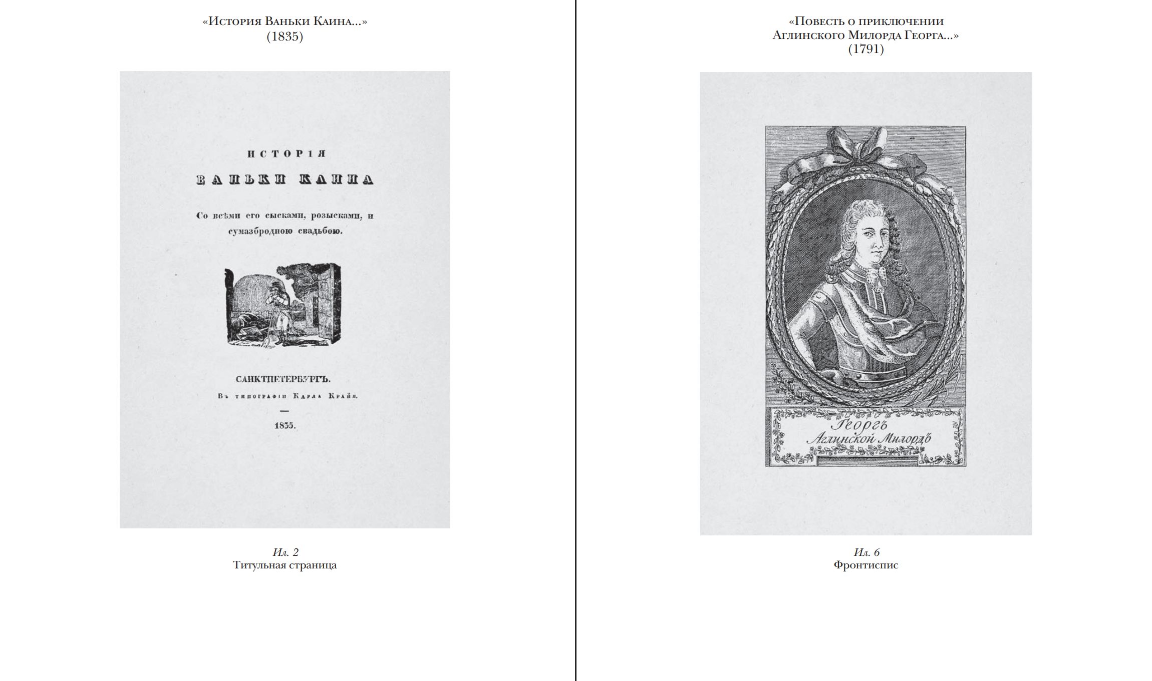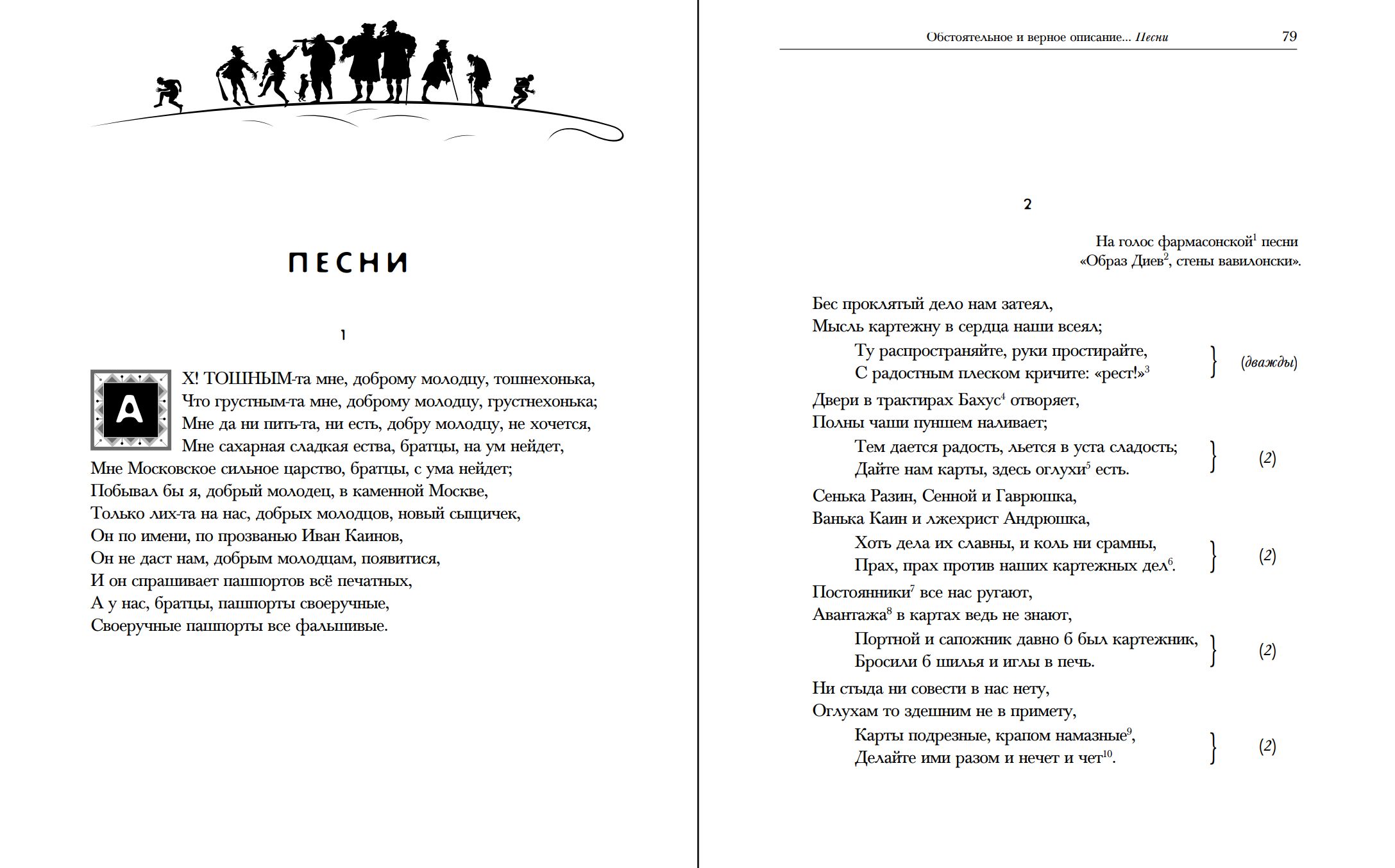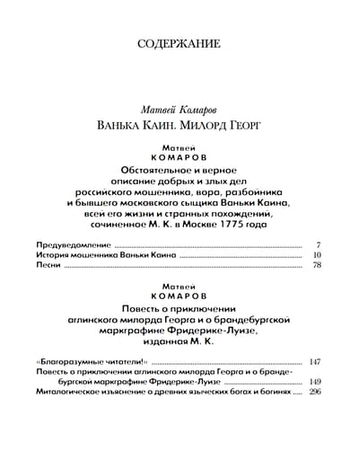 В издание вошли два наиболее известных произведения. Первое — повесть о разбойнике Иване Осипове (Ваньке Каине), основанная на реальных событиях. Герой, став служащим Сыскного приказа, ведёт двойную жизнь, сочетая роли сыщика и преступника. Динамичное повествование, близкое к европейскому плутовскому роману, дополняется подборкой из 47 песен, передающих колорит эпохи.