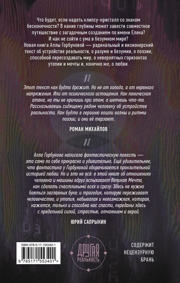 Что будет, если надеть клипсу-кристалл со знаком бесконечности? В какие глубины может завести совместное путешествие с загадочным созданием по имени Елена? И как не сойти с ума в безумном мире? Новая книга Аллы Горбуновой — радикальный и визионерский текст об устройстве реальности, о разуме и безумии, о поэзии, способной пересоздавать мир, о невероятных горизонтах утопии и мечты и, конечно же, о любви.