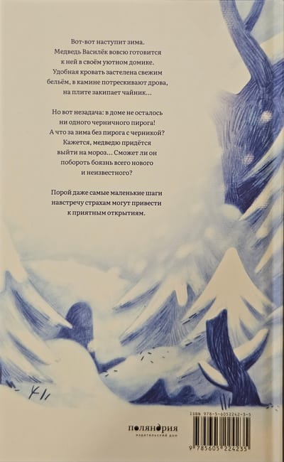 Вот-вот наступит зима. Медведь Василёк вовсю готовится к ней в своём уютном домике. Удобная кровать застелена свежим бельём, в камине потрескивают дрова, на плите закипает чайник... Но вот незадача: в доме не осталось ни одного черничного пирога! А что за зима без пирога с черникой? Кажется, медведю придётся выйти на мороз... Сможет ли он побороть боязнь всего нового и неизвестного? Порой даже самые маленькие шаги навстречу страхам могут привести к приятным открытиям.